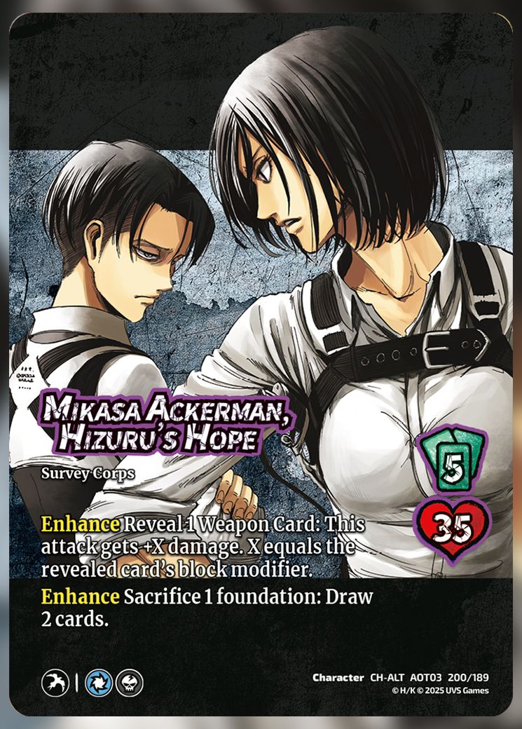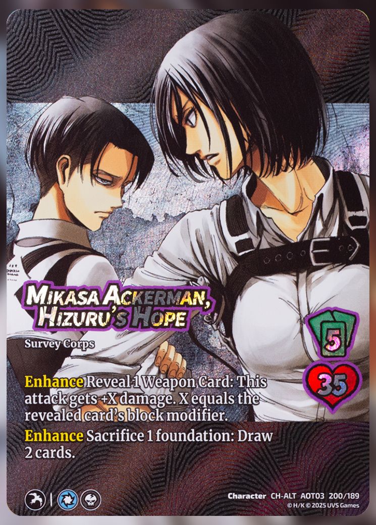近い | ミカサ・アッカーマン、ヒズルの希望調査隊 - 5ハンドサイズ - 35健康 - 空気/死 強化する1つの武器カードを表示:この攻撃は +xダメージを受けます。 xは、明らかにされたカードのブロック修飾子に等しくなります。 強化する犠牲1基礎:2枚のカードを描きます。 |