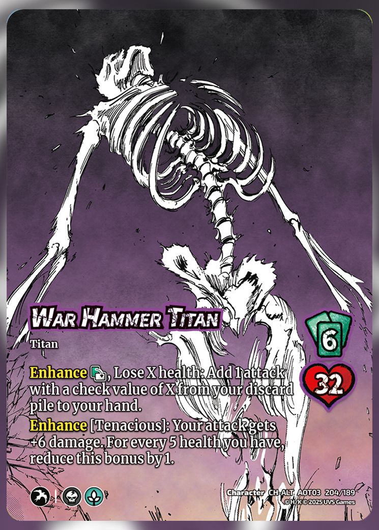 しかし、私のお気に入りのカードは、ウォーハンマータイタンでなければなりません。奇妙なことに、これは他のタイタンのような変容カードではありません(おそらくララティブルは自分のカードを持っているほど興味深いキャラクターではありません)が、その力は実に恐ろしいです。攻撃から攻撃を跳ね返すための強化効果として健康を支払うことができます。そして、あなたがあなたの健康を十分に壊して十分に失うならば、あなたの攻撃は+6にバフアップすることができます。それは本当にクールなガラスの大砲のようなビルドであり、最大の損傷のためにあなたが2つの健康にしか下ってもらいたいと思っています。