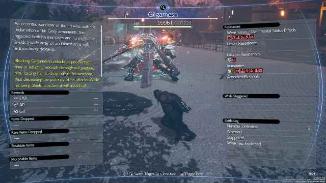 ギルガメシュは攻撃を発火させるのが弱い、だから必ず火のマテリアを装備してください。圧力バーを構築するために火を燃やし、彼が健康棒をすばやく排出するためにずらされたときの制限休憩を節約します。使用することをお勧めします毒そしてデブレーブ彼に、それは彼のもう一つの弱点です。毒はゆっくりと彼の健康を減らしますが、デブレーブは彼の攻撃を弱くし、ダメージを減らします。