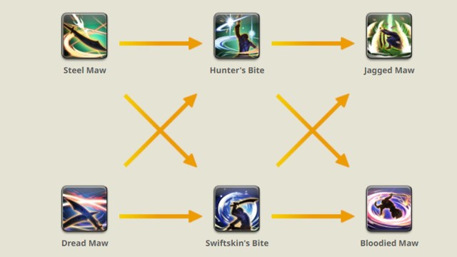 スチールの牙と恐怖の牙(単一のターゲットコンボのスタートストライク)は本当に同じものですが、後者は呼ばれるデバフを適用します有害なgnashこれにより、ターゲットにダメージが10%増加します。そこから、ハンターの刺し傷とスウィフトスキンの刺し傷が適用されますハンターの本能そしてSwiftscaledそれぞれ。前者は、あなたが対処する損害をさらに10%増加させ、後者は自動攻撃の遅延を減らします。
