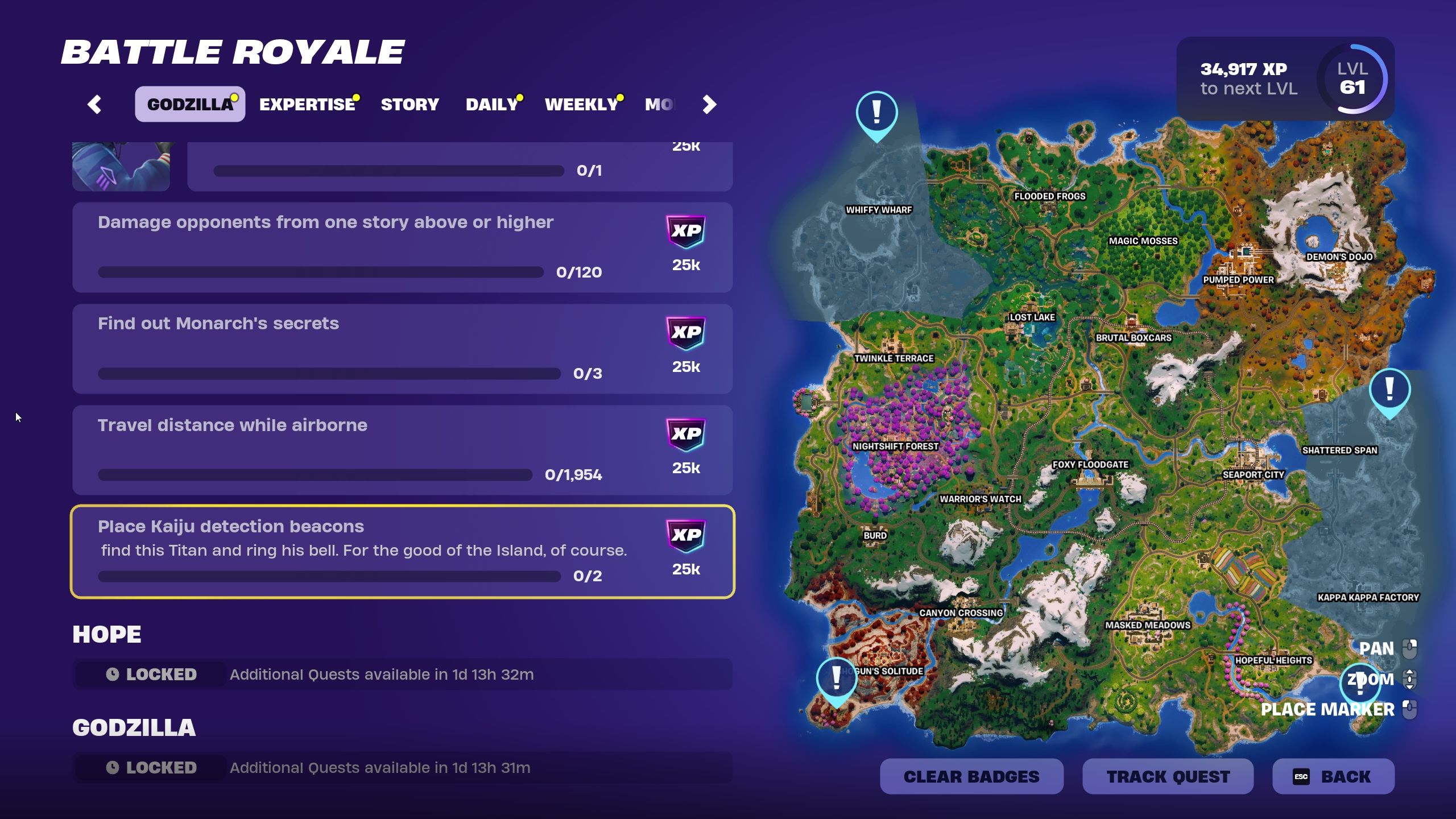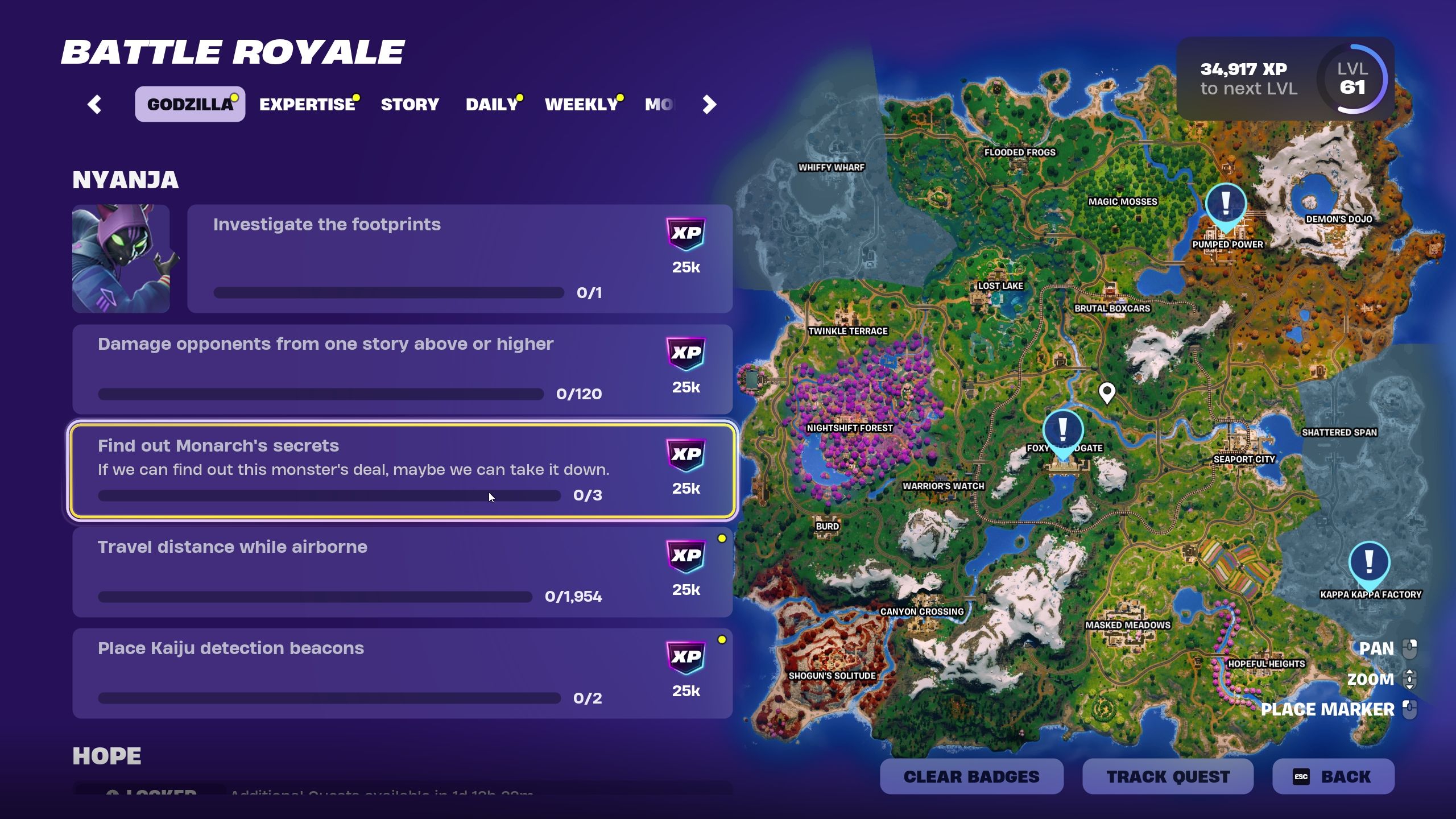 奇妙で巨大なモンスターが登場していますFortnite地図、破壊を引き起こす、そしてこの状況にはすぐに注意が必要です。それがあなたが来るところです - あなたの仕事は、地図の東側に何が起こっているのかを調査し、カオスの源を明らかにすることです。 Godzillaがゲームに参加していることを意味します。これは、真新しいクエストセットが利用可能であることを意味します。