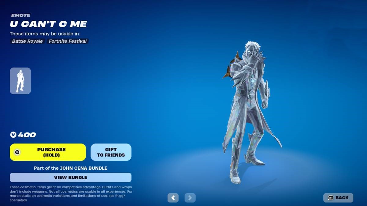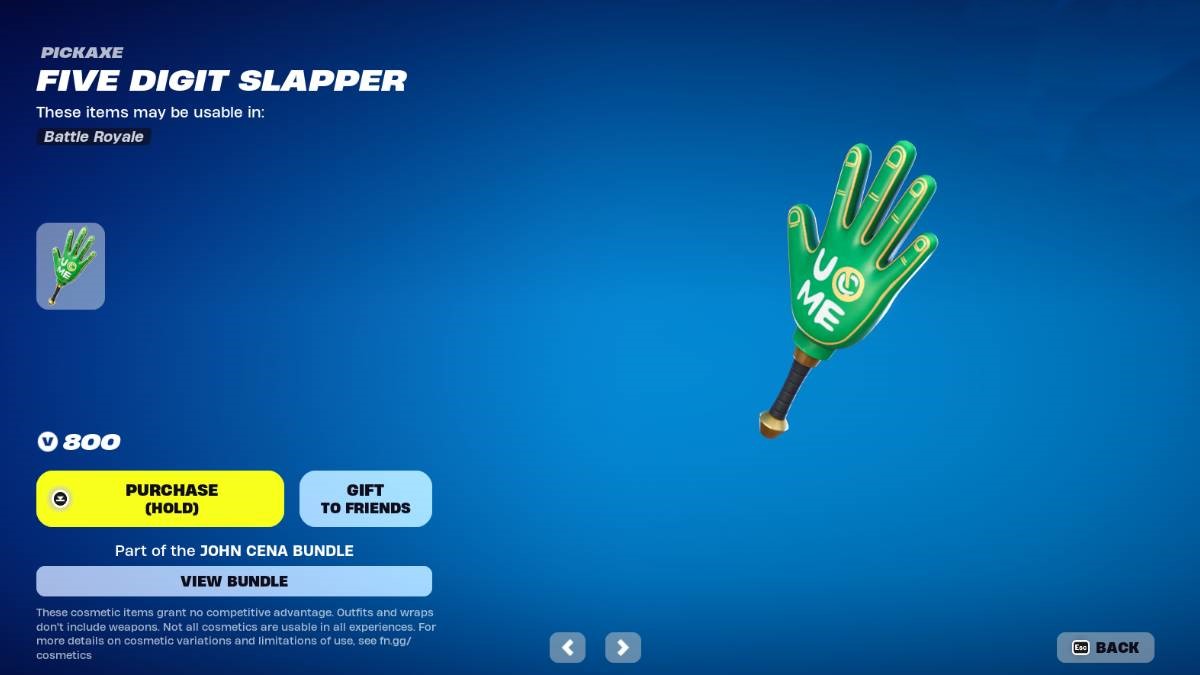 - アイテムが含まれます:John Cena Skin、5桁のスラッパーPickaxe、U Can c Can c Can c Me Emote、WWE Championship Title Back Bling。