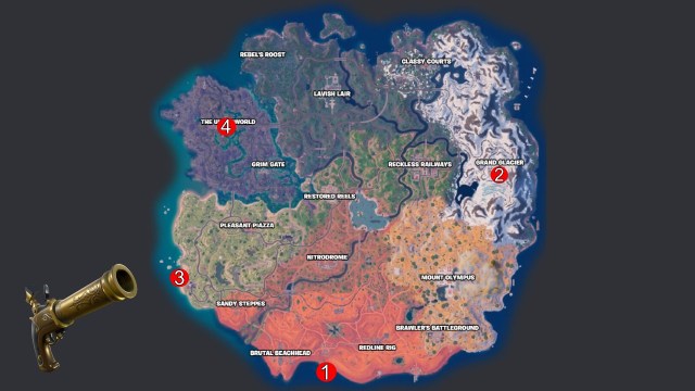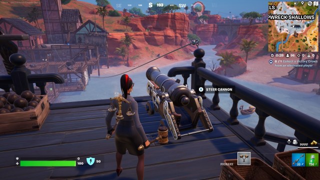 島の両方の海賊船で、プレイヤーは見つけることができます大砲他のプレイヤーに発砲したり、(安全に)遠く離れて撃つこと。このクエストを完了する最も簡単な方法は、することです大砲に飛び乗って、可能な限り自分で発射してください空に。合計500メートル移動するまですすぎ、繰り返します。