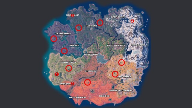 武器ケース主にスポーンしますバンカー、試合の後半で開いていますが、特定の他の場所でも見つけることができます。 Fortniteのすべての武器ケース(番号付き)とバンカー(丸)の場所については、上記の地図を確認してください。
