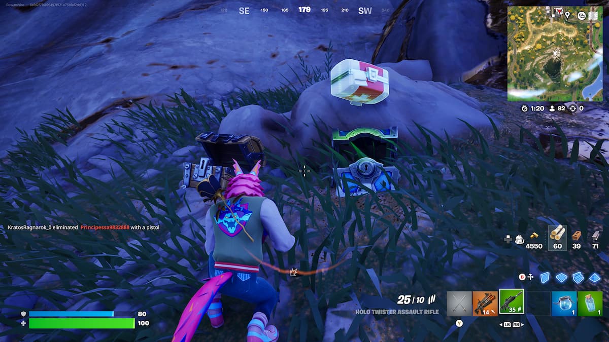 オオカミのハウルが聞こえ、クエスト完了バナーがポップアップします。バトルバスからすぐに着陸している場合は、オオカミの足元に着陸するのが最善です。彼の爪に触れてクエストをトリガーしてから、足の周りの丸い樽と胸を探してください。この秘密のクエストを完了するためにXPの報酬はありません。それを完了するために必要なスキンはすべてショップまたはバトルパスからのものであり、これを一種のペイプレイイースターエッグにしています。
