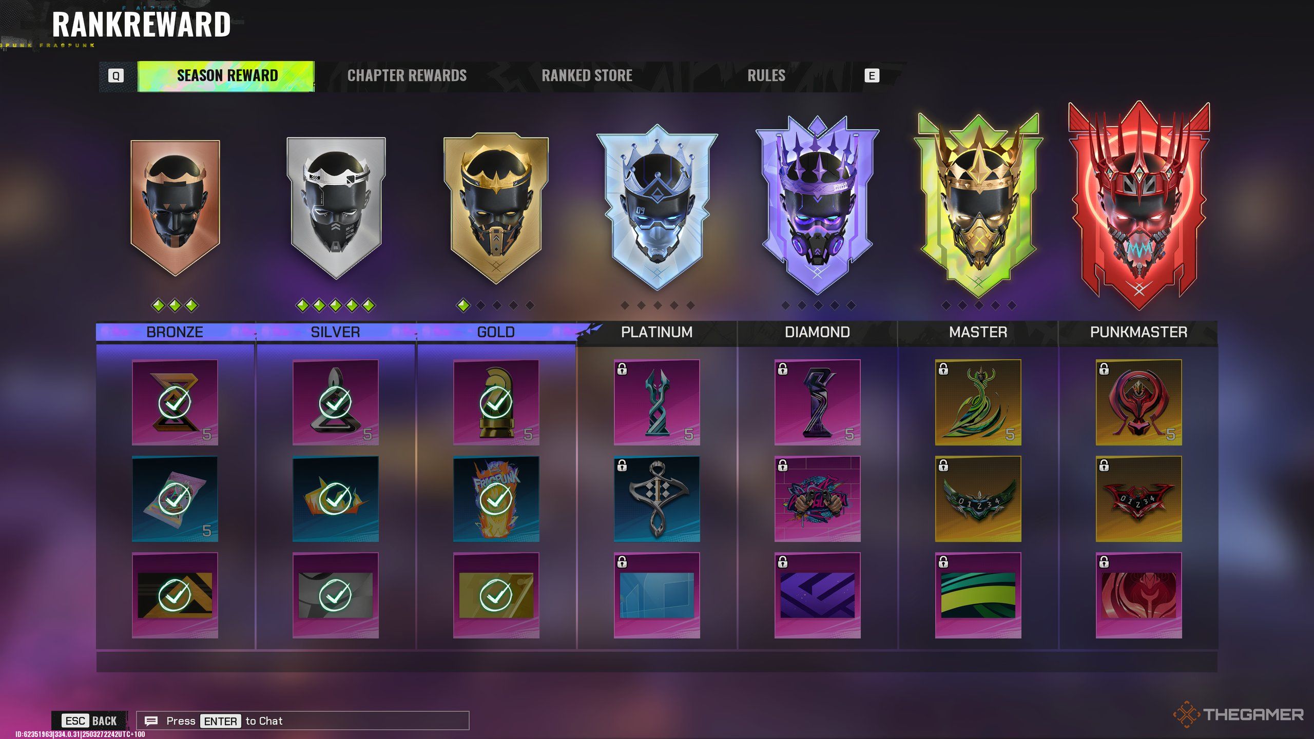7つのランクがあります:ブロンズ、シルバー、ゴールド、プラチナ、ダイヤモンド、マスター、パンクマスター。各ランクにあります5つの層、3つの青銅と1つのパンクマスターを除きます。ランクを前進させるには、通過する必要があります最初に各層、5番目から始まり、最初のものに登ります。各部門では、合格するには100 RPが必要です。