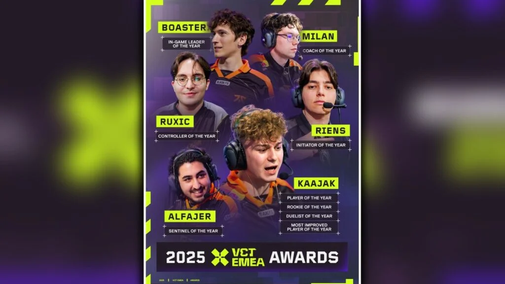 NRGの勇敢な活躍は、VALORANT Champions 2025でMVPを獲得した後、ルーキー・オブ・ザ・イヤーとイニシエーター・オブ・ザ・イヤーの両方を獲得しました。MIBRのアスパスは、シーズン中の全体的な優位性を受けて、デュエリストとプレーヤー・オブ・ザ・イヤーの賞を獲得しました。