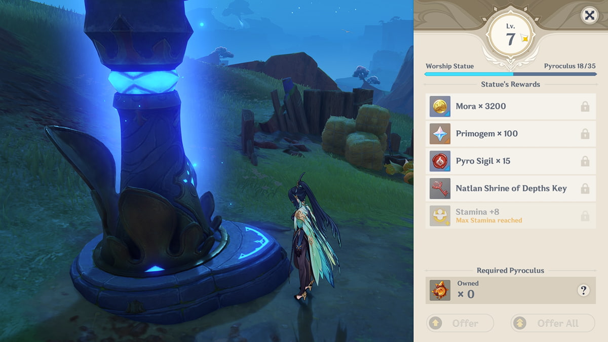 深さの鍵のナトラン神社を取得するもう1つの方法は、Pyroculusを提供して、7つのPyro像をアップグレードすることです。次のレベルでキーを提供します: