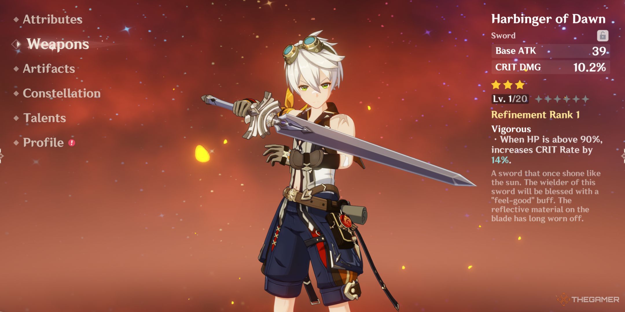 旅行者の便利な剣 | 448 ATK | 29.3%def | エネルギー粒子を拾うたびに、1〜2%のHPを回復します。 |