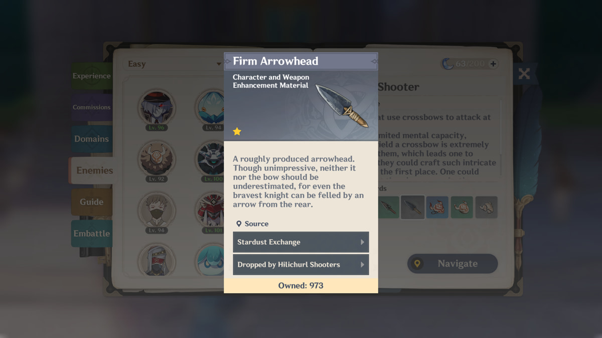 ヒリチュールの射手を倒すことで、しっかりした矢じり、鋭い矢じり、風化した矢じりを耕すことができます。彼らはゲームで打ち負かすのが最も簡単なモブの1つであり、Teyvatマップ全体に見つけることができます。ゲーム内ショップから矢印を入手することもできます。
