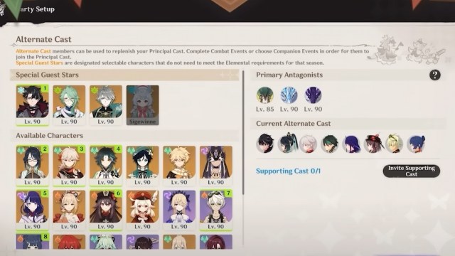 校長キャストを選択した後、あなたは決定する必要があります代替キャスト8文字の。代替キャストを使用してプリンシパルキャストを補充することができ、戦闘イベントやコンパニオンイベントを完了してプリンシパルキャストに参加させることができます。選択もあります特別ゲストスターシーズンの要素要件を満たしていない場合。