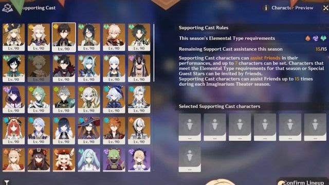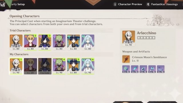 難易度を選択した後、決定することができます校長キャストの6文字。キャラクターの兵器庫やトライアルキャラクターから選択できます。プリンシパルキャストのゲインとして選んだ6人のキャラクター幻想的な祝福ユニークなバフです。これらのバフのクールなことは、シーズンの終わりまでイマジナリウムシアターの内外で発効することです。
