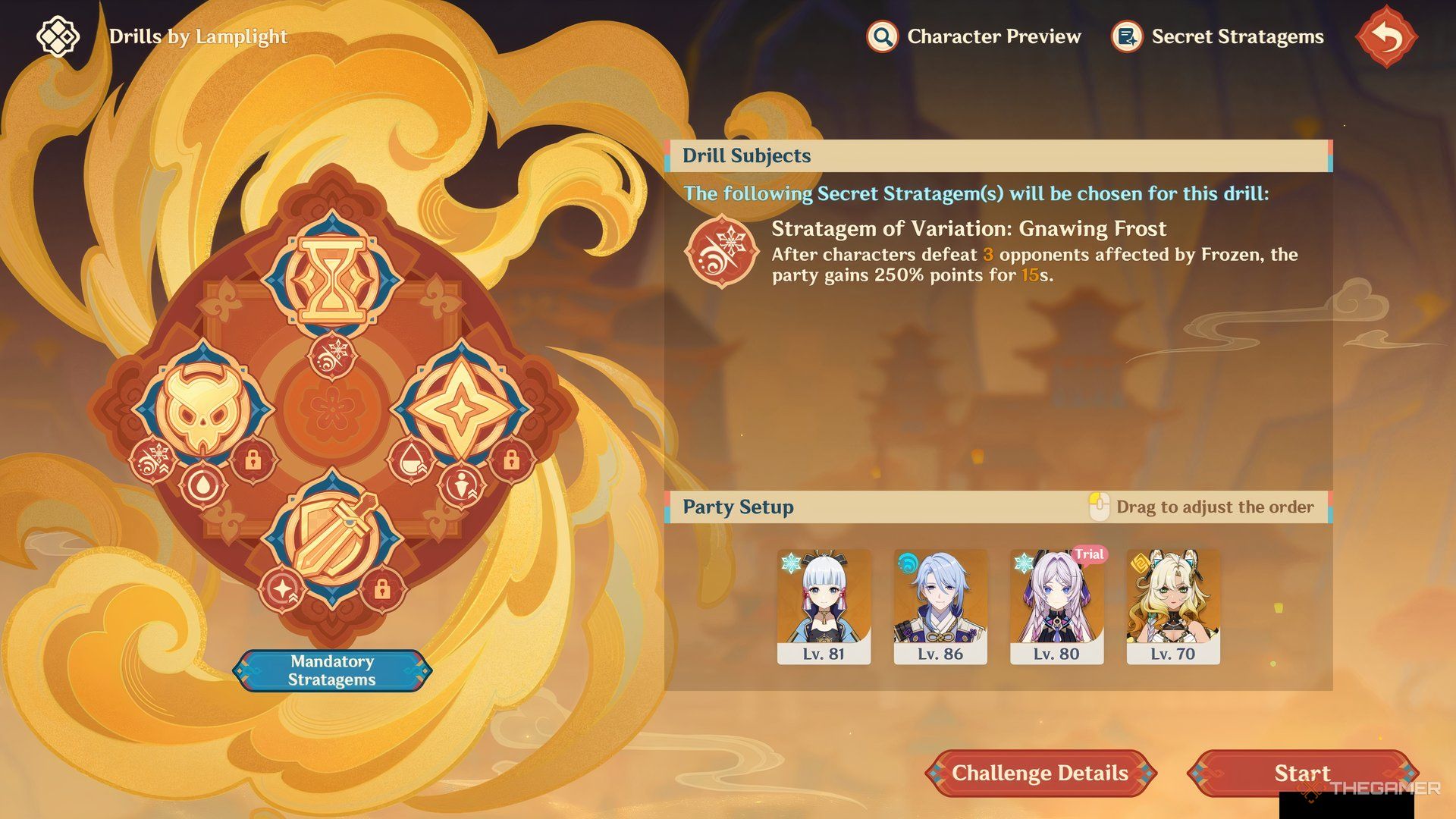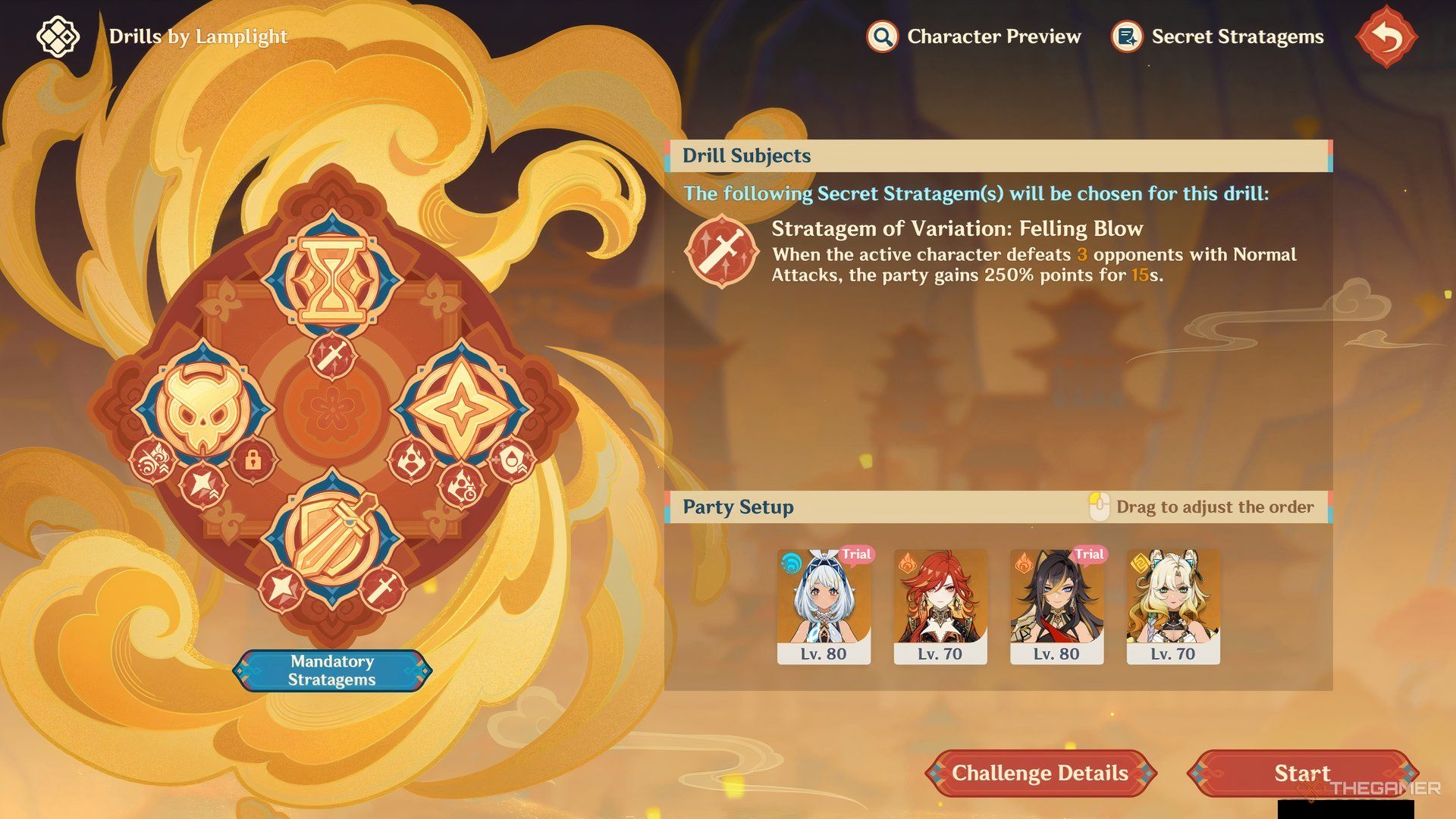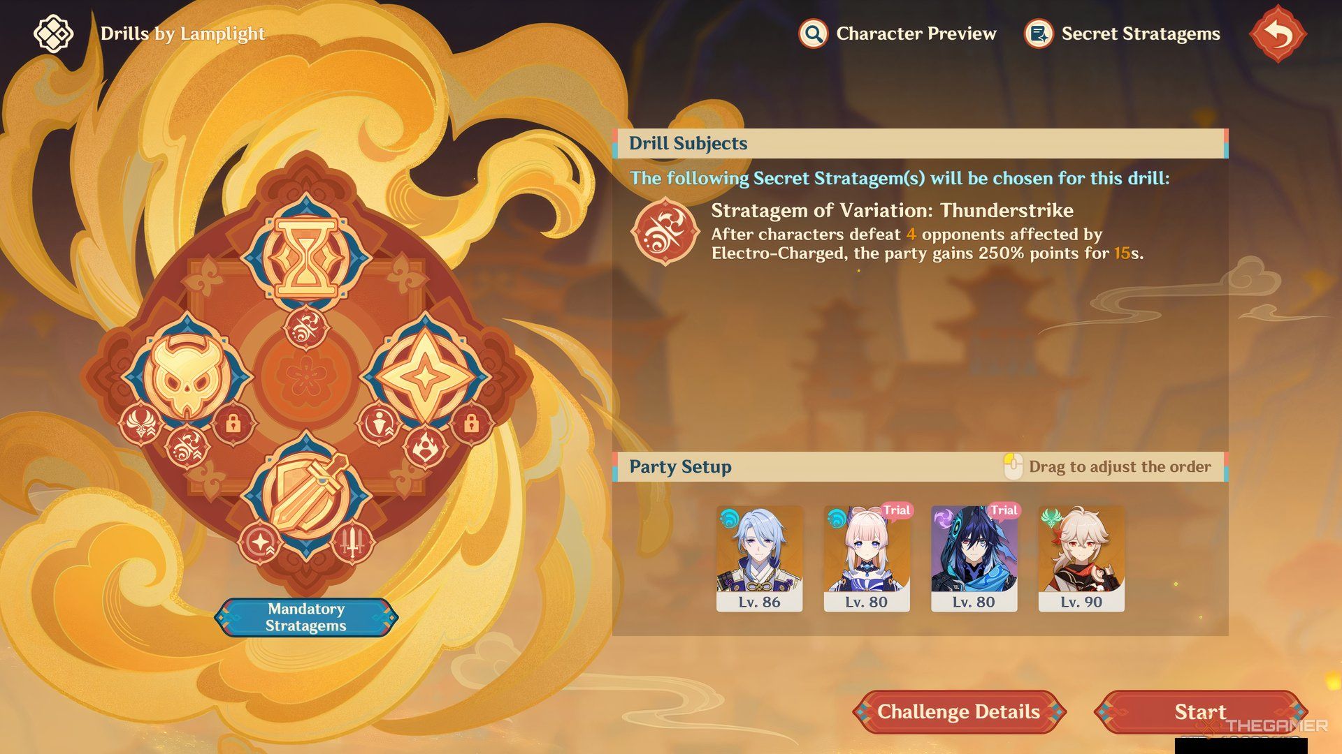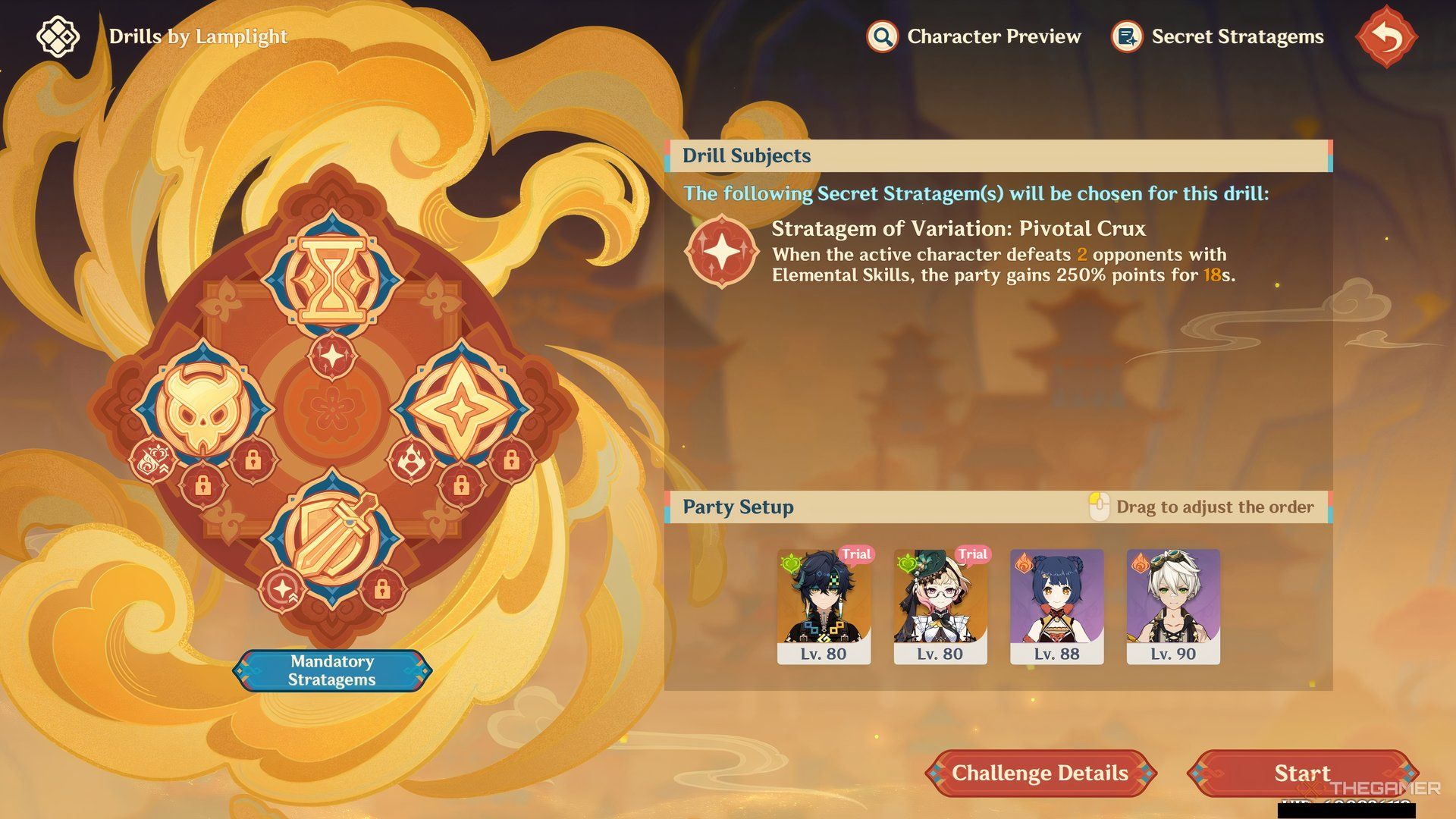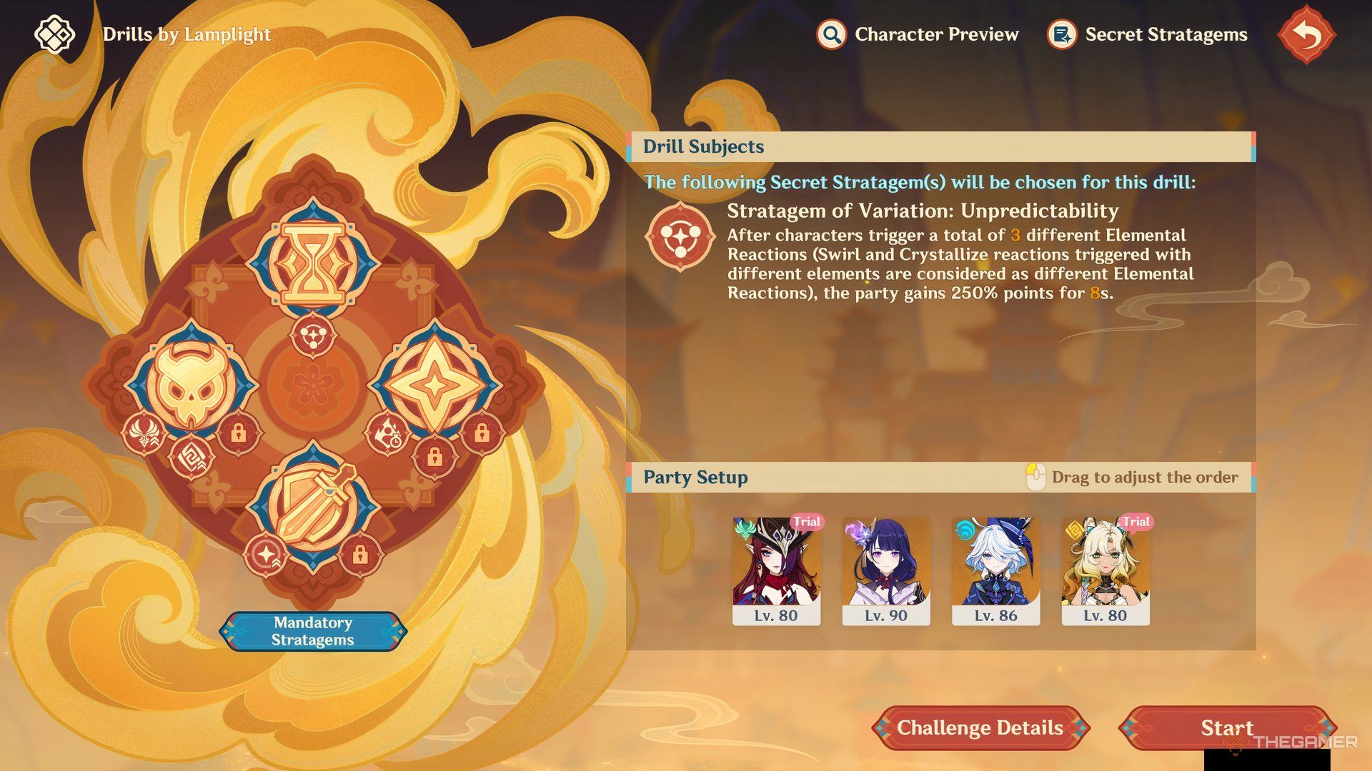 この段階では、バリエーションの戦略:予測不可能3つの異なる元素反応をトリガーすると、得られたポイントが250%増加します。そのため、元素の反応を引き起こし続け、簡単にできる組成物を選択する必要があります。あなたも受け取りますチャスカとキシロネンは試験キャラクターとしてこの段階で。