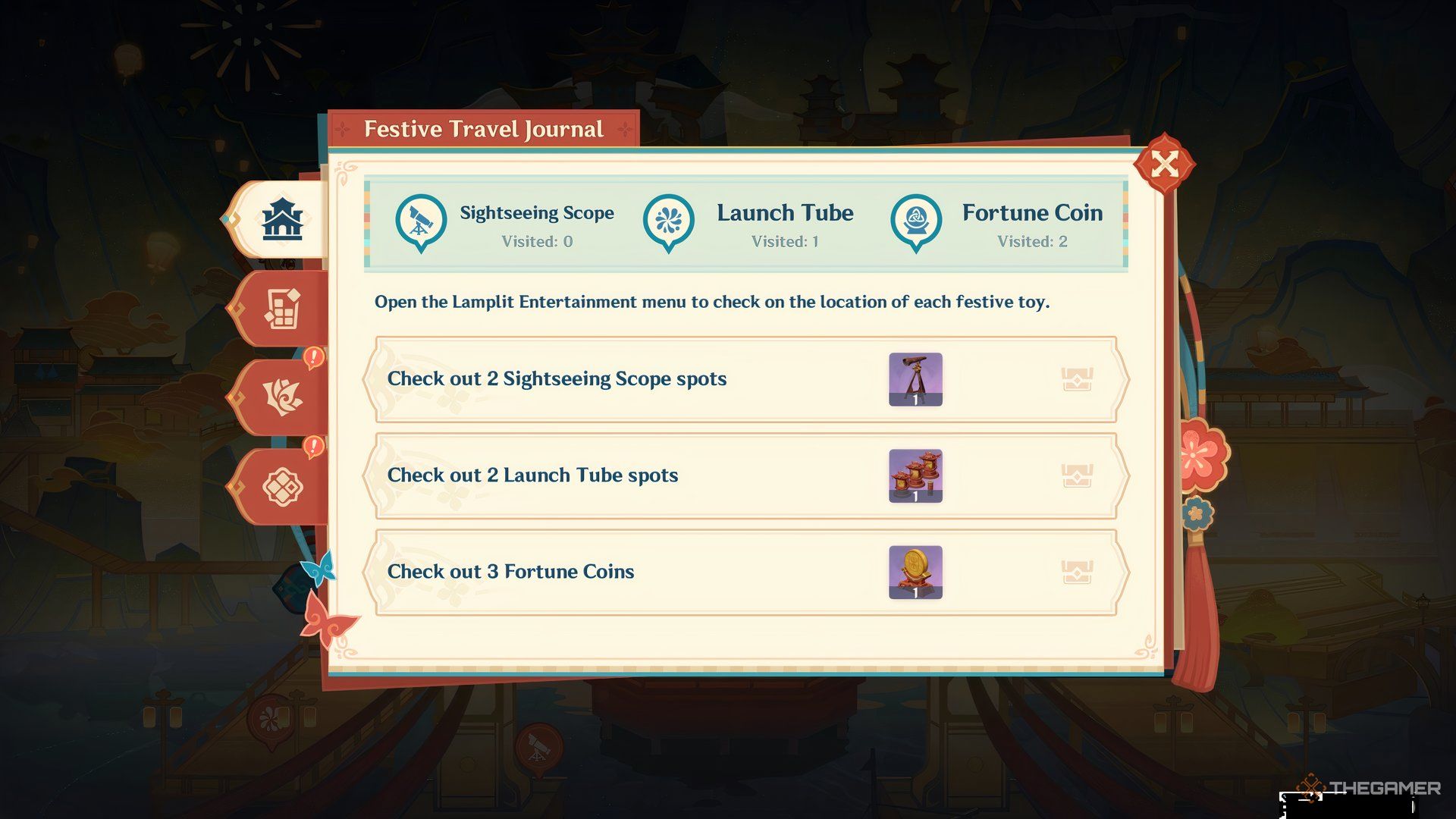 このアクティビティでは、さまざまなおもちゃを訪問してやり取りする必要がありますそれは、Liyue港全体の旅行省によって置かれています。これらのおもちゃには含まれています発射チューブ、フォーチュンコイン、観光スコープ。場所はランタンの儀式のメインマップにマークされており、ミニマップでマークされていることもあります。