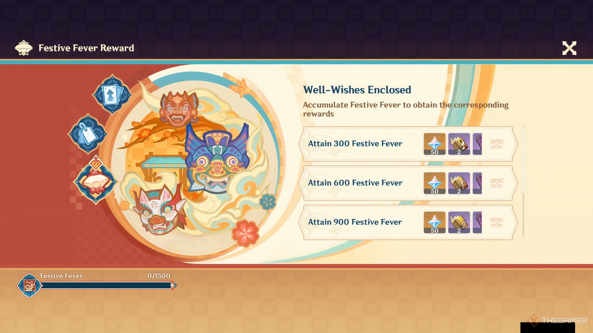 Primogemsを受け取ることに加えて、ここでの主な目的は、お祝いの熱を集めることです。さまざまなタスクを完了するとお祝いの熱が届き、特定の要件を満たしたら、無料の4つ星のキャラクターを請求できます。