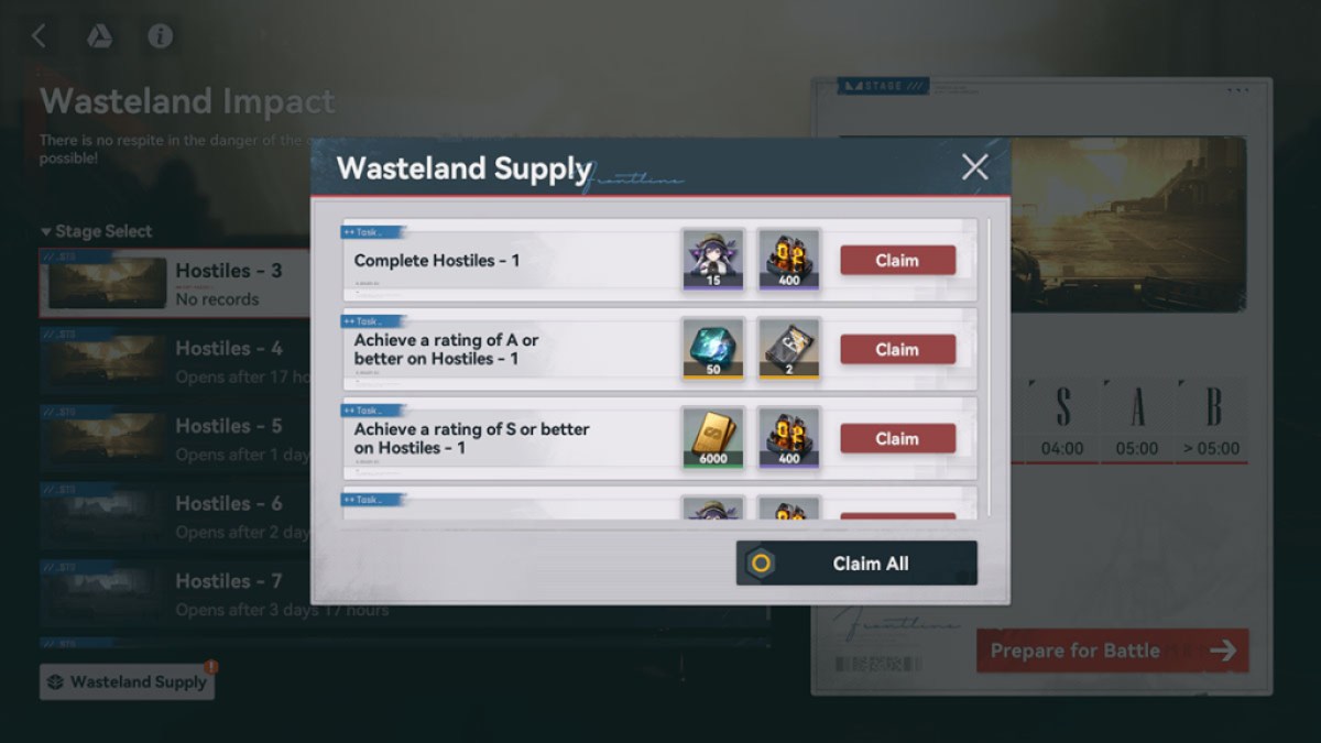Wasteland Supplyをプレイすることで、合計22セットの報酬を請求できます。以下に示すように、十分なランキングで各モードのステージを完了することで、それらすべてのロックを解除できます。