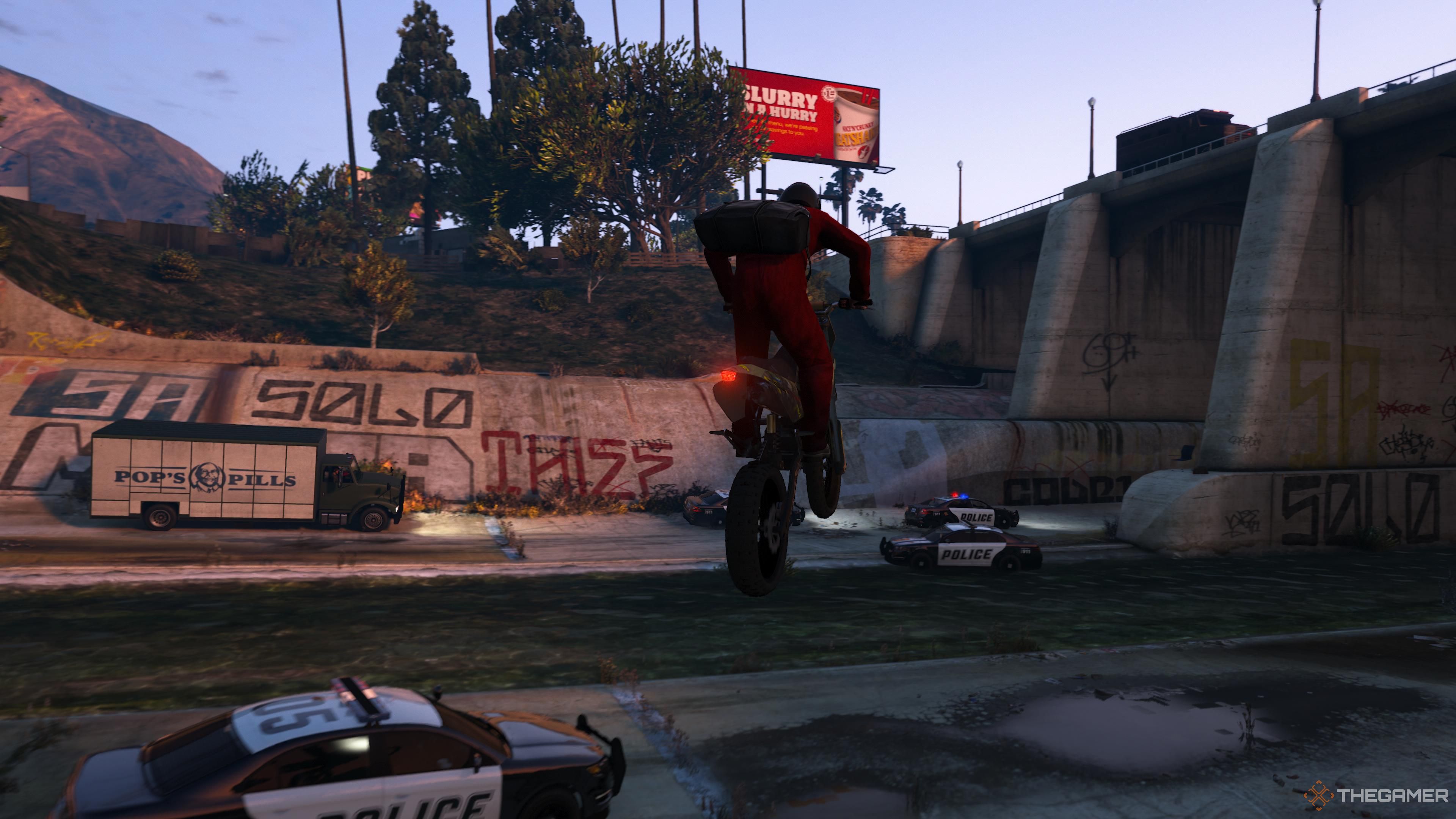 それが完了したら、コントロールはフランクリンに戻ります、そして、あなたは警察から逃れるためにオートバイを使わなければなりません。2人のガンマンの近くに固執し、あなたのスピードに注意してください、速すぎると、取り扱いが難しくなります。それらを高速道路に連れて行き、次にトンネルに降りて、狭いスペースを織り込んでコースにとどまります。