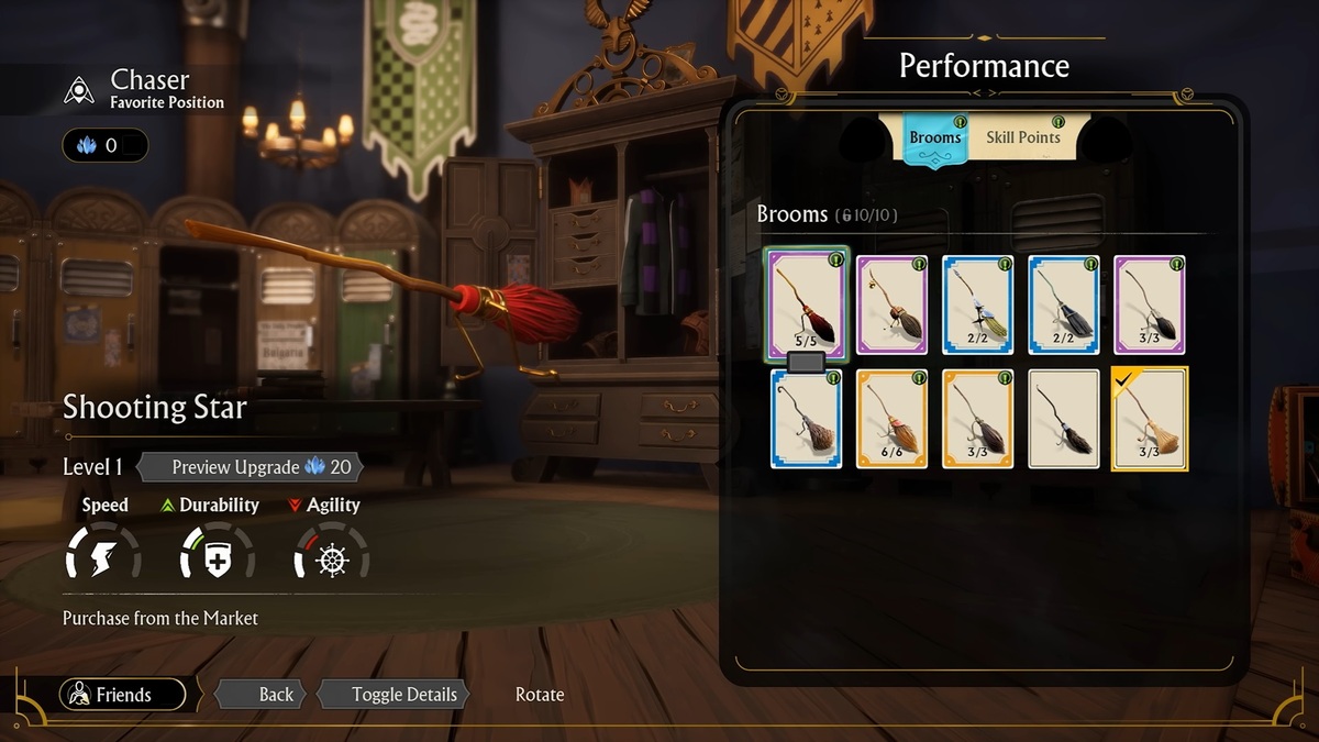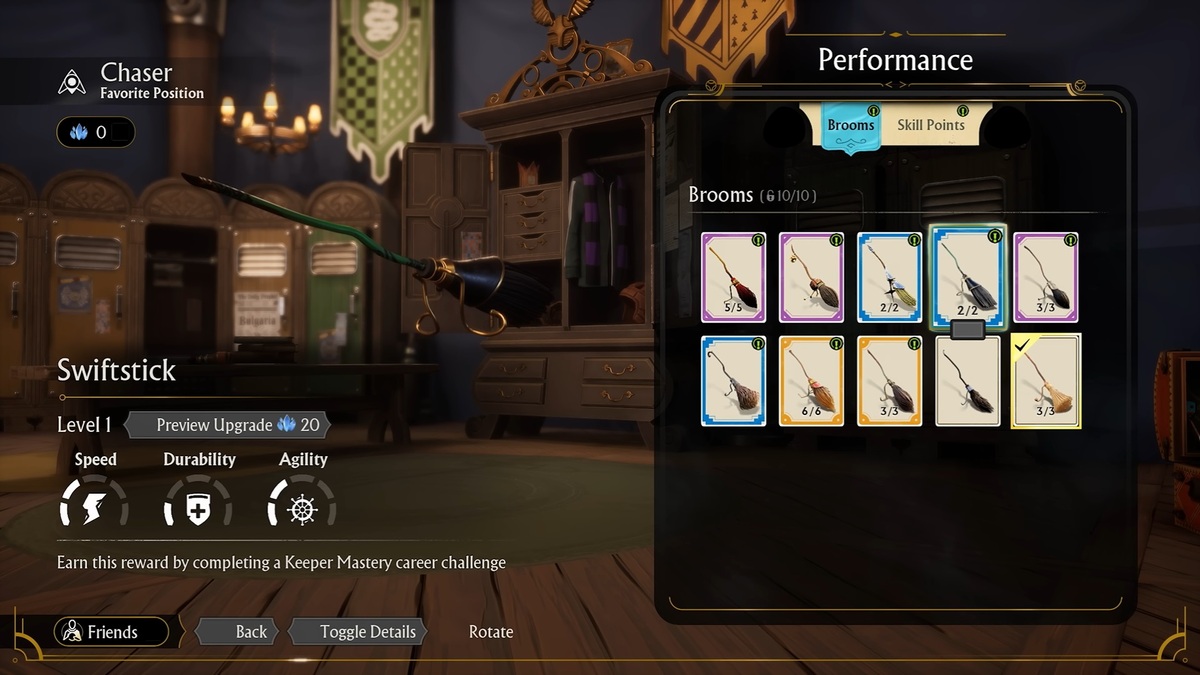 SwiftStickはスピードと敏ility性のために設計されているため、試合中にクイックマニューバーと速い休憩を優先するプレーヤーに最適です。タイトなスペースをナビゲートしてぼやけた人を避ける必要があるチェイサーまたはシーカーとしてプレイする場合、SwiftStickを使用すると、空中で鋭いターンと迅速な調整を行うことができます。ただし、このほうきには肌が1つしかありません。これは、すべてのキーパーマスターキャリアの課題を完了した後にロック解除されます。