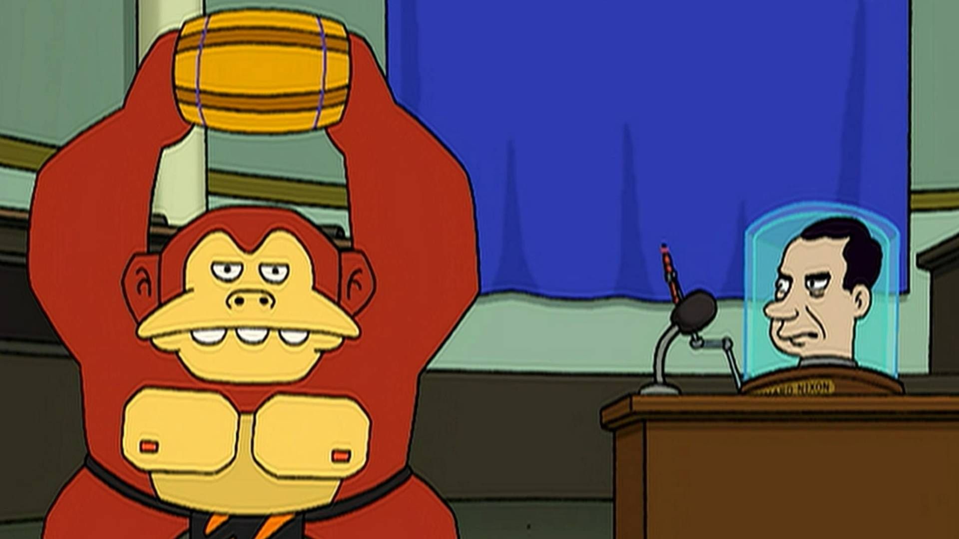 2002年初頭、ポジティブに沈んでいないFuturamaの50回目のエピソードでは、ロンキーコングであることを非常に明確に意図したキャラクターがリチャードニクソン大統領の具体化されていない頭に樽を投げているシーンを特徴としています。