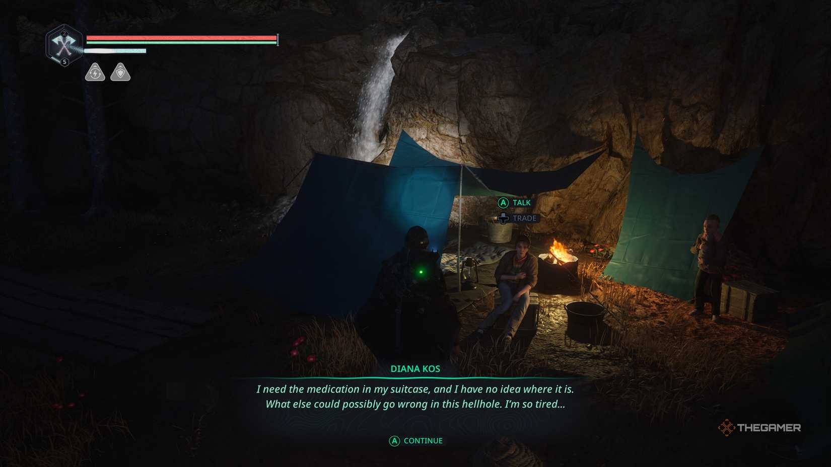 内部では、犬の喪失、赤ちゃんを抱いている年少の子供を嘆く老人と女性が見つかります。彼女の薬を失ったダイアナという名前の若い女性。また、いくつかのアイテムがある鉱山もありますが、これらの人々にとって有用ではありません。ダイアナの薬は、実際にこの場所の早い段階で見つかりました、スーツケースのヴィタリスの墓からわずか少し離れています。オン車両キーを見つける前に、これを今すぐ彼女に持ってきてください。