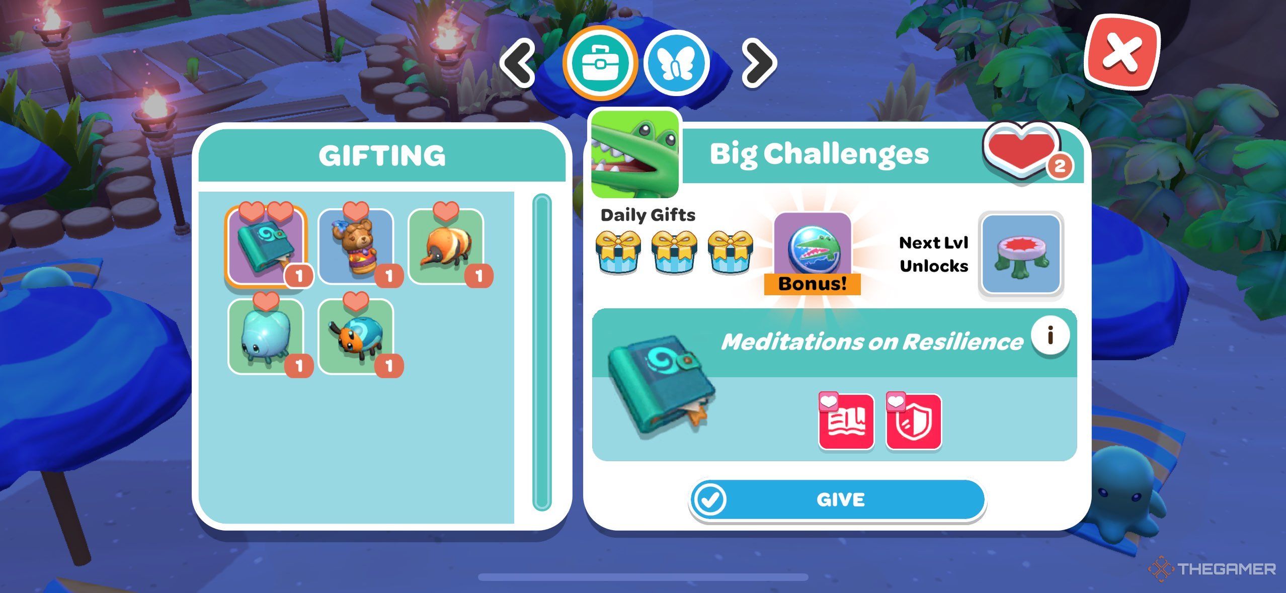 大きな挑戦がキャラクターに参加した後、できますあなたの友情を和らげるために彼に贈り物をしてください。全体として、大きな課題は贈り物が好きです火山、回復力、および本タグ。これらはのように見えます火山、盾、本、それらをかなり簡単にします。