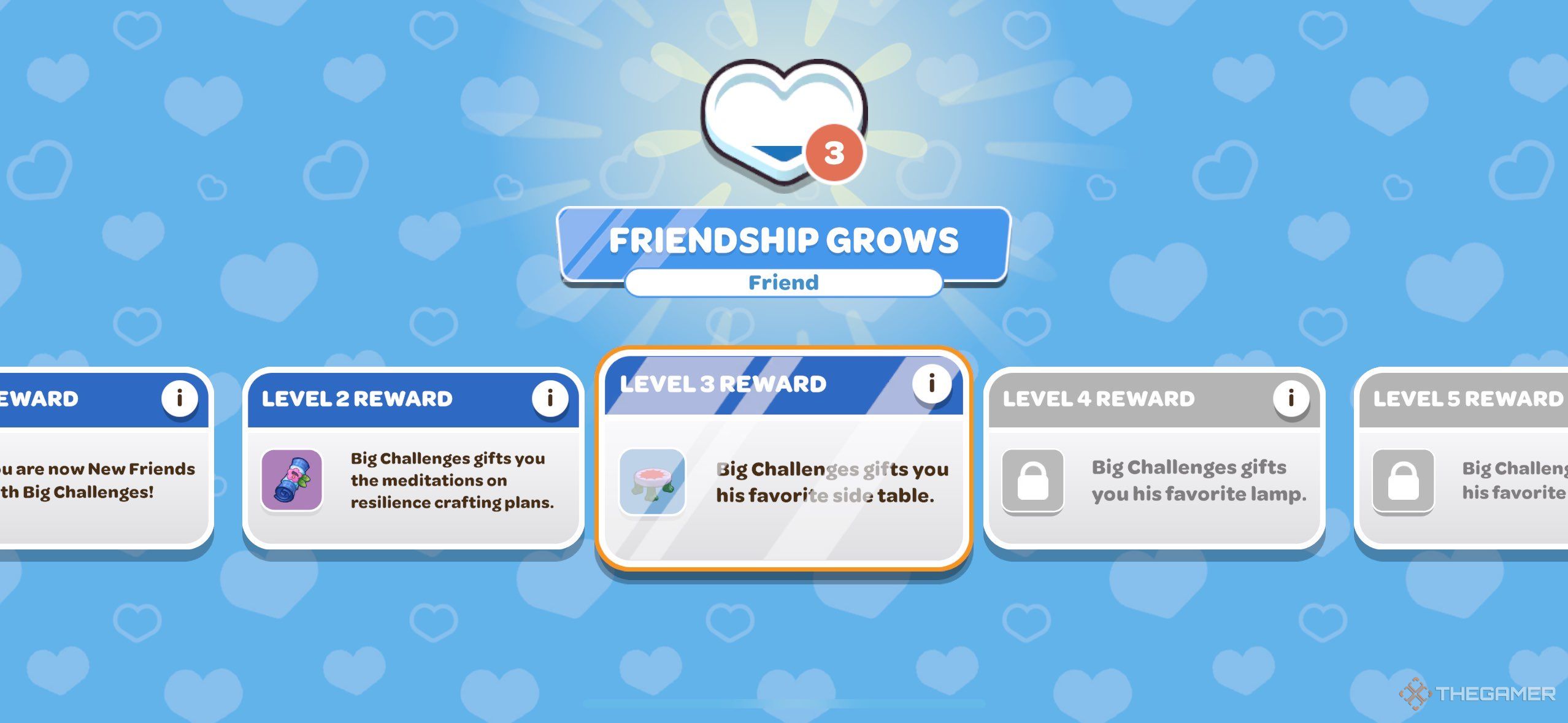 がある大きな課題で進歩できる20レベルの友情。興味深いことに、これは彼の親友であるTophatとしての友情レベルの2倍です。以下では、すべての友情レベルとそれに関連する報酬を確認できます。