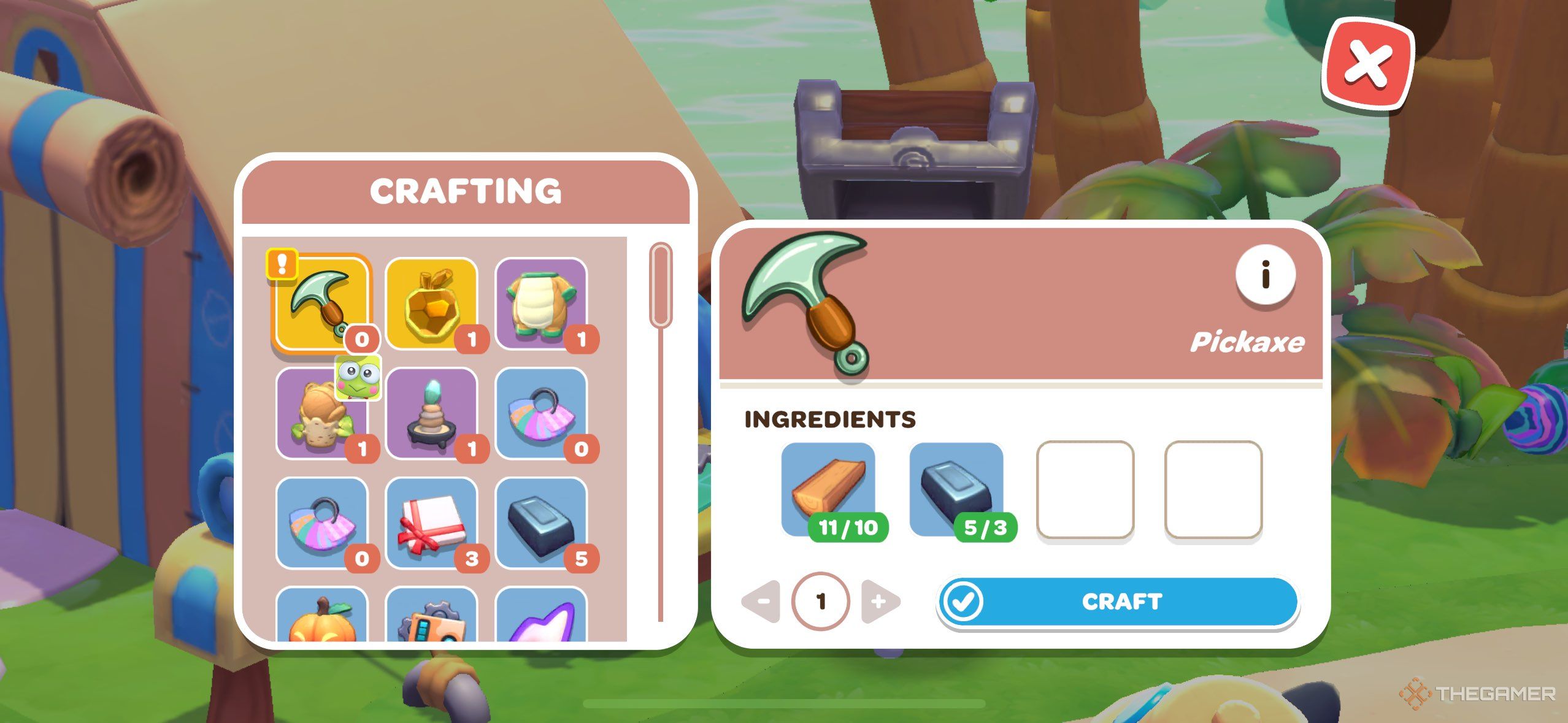 ピタックスを作るには、クラフトステーションに戻ります。ここでは、する必要があります10個の木ブロックと3つのインゴットを使用して作成します。作られたら、する必要がありますトレッキングをチョコカット、私のメロディー、ケロッピに戻してください。