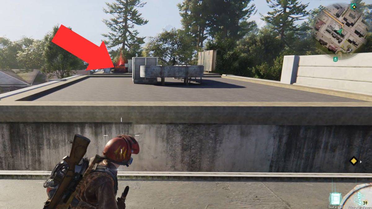 東側から町に入る場合、右側の大きな倉庫を通過し、右側の最初の建物のセットには、あなたに最も近い下の屋根にギアクレートがあります。建物の前の車に飛び乗って、屋根にジャンプすることで、それに到達できます。
