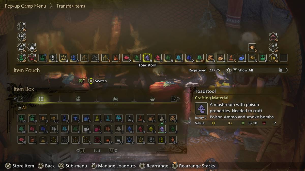 無駄ではありませんが、アイテムポーチからアイテムを削除するためのゆっくりと便利な方法は、ベースキャンプやポップアップキャンプのテントのアイテムボックスに移すことです。テントを入力し、アイテムメニュータブでアイテムの転送を選択し、アイテムポーチを選択し、アイテムボックスに転送するアイテムを強調表示し、X/Aを押して「アイテムを保存」します。