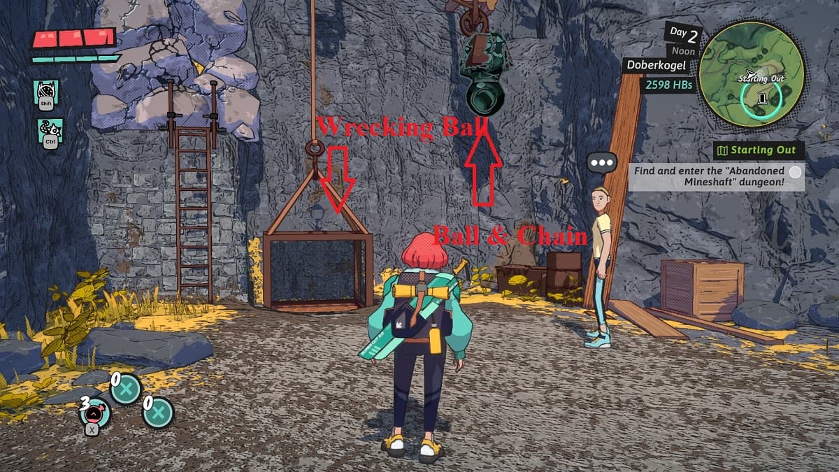 最後に、放棄されたミニシャフトへの道をブロックする最後の障害物に到達します。これは、はしごの上にある岩を壊さなければならないので、少しのタイミングが必要です。幸いなことに、これを解決するために使用できるプーリーシステムが近くにあります。レッキングボールをキャストして、クレートに転がります。次に、黒いゼリーにボールとチェーンを使用して、それを引っ込めて木枠を引き上げます。レッキングボールが岩の横になったら、それを爆発させてそれらを取り除きます。それで、最終的に2番目のダンジョンに入ることができます。