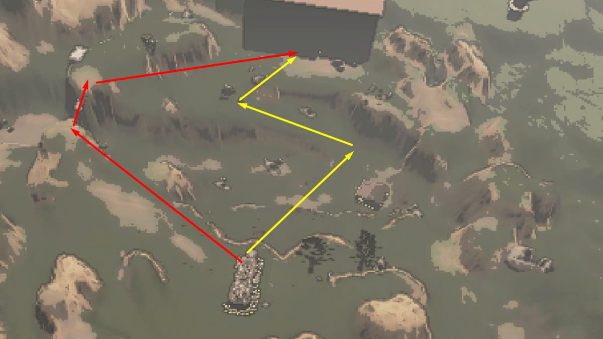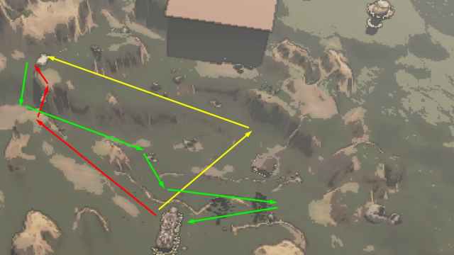 赤い線には、壊れた橋を左に渡り、「回る」ことが含まれます。一方、黄色のものは中央の森を通り抜けます。