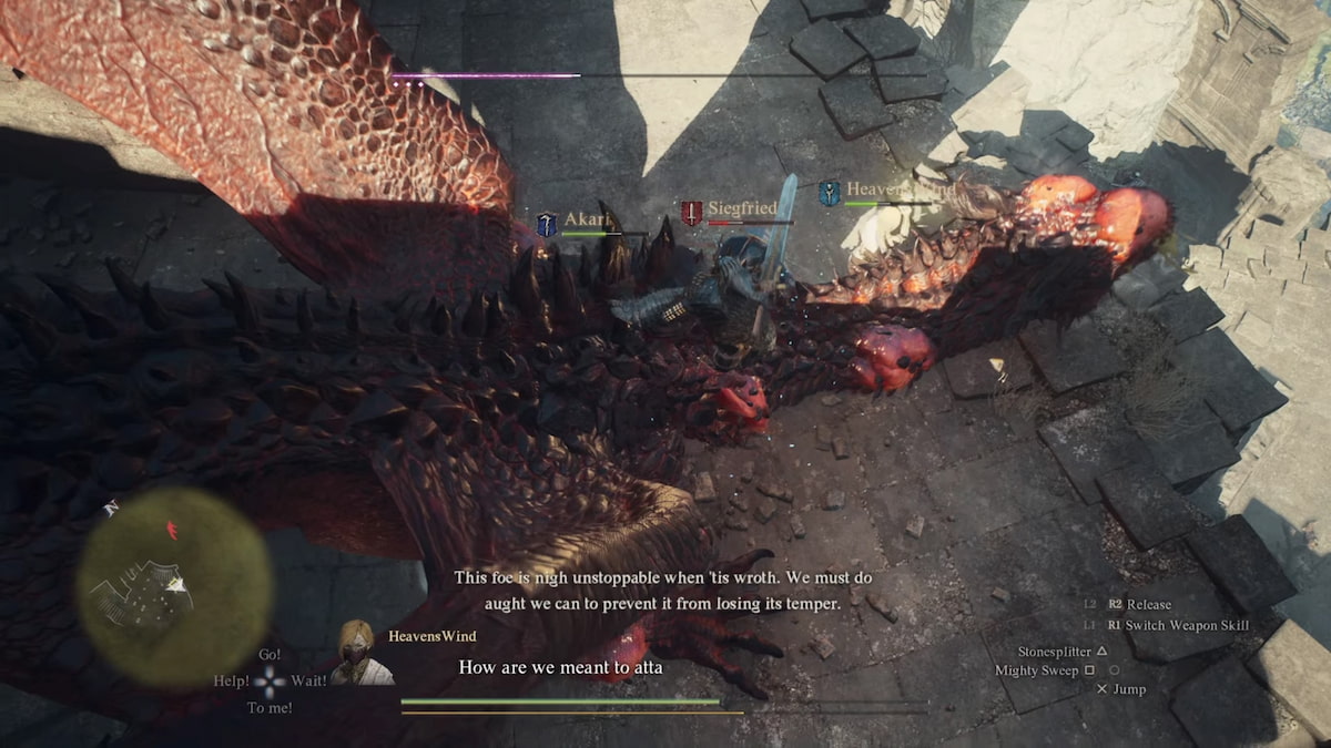 これらの膿疱を破壊すると、両方の大きなダメージを引き起こすだけでなく、ドラゴンを踏みつけます。で大成功を収めました泥棒そして、アーチャー/マジックアーチャーは、登山または撮影のいずれかによって弱点を正確にターゲットにできるからです。ドラゴンがずらされたらすぐにこの機会を使用して、頭に代替スキル(PS5の三角形)を使用します。