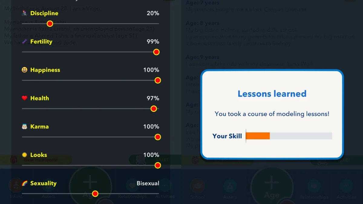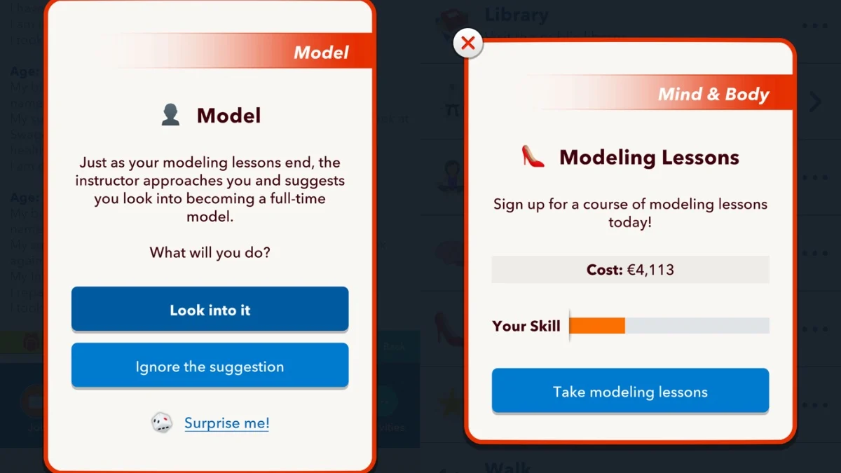 キャラクターが老化するにつれて、彼らはモデリングのレッスンを受けるように求められるかもしれません。または、10歳頃に中学校を訪れたら、それらを服用することを選択することもできます。クラスを受講してから、毎年心と身体のセクションに入り、レッスンを受けてモデリングスキルを向上させます。