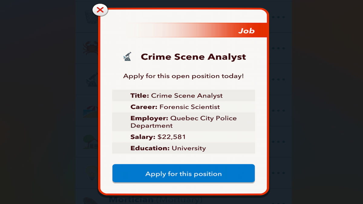 大学を卒業したら、残っている唯一のステップは、法医学科学者の空席を探すことで、インタビューを申請することです。をクリックします仕事メインメニューの左下にあるオプションを使用して、タイトルの求人を探してください犯罪現場アナリストまたは犯罪現場の技術者欠員のリストから。見つけた場合は、1つを申請してから、一般的な生活/犯罪に関連する簡単な質問に答えて仕事を得ます。また、見つからない場合は、アプリケーションまたは年齢を再起動して、新しいオプションセットを見つけるために。