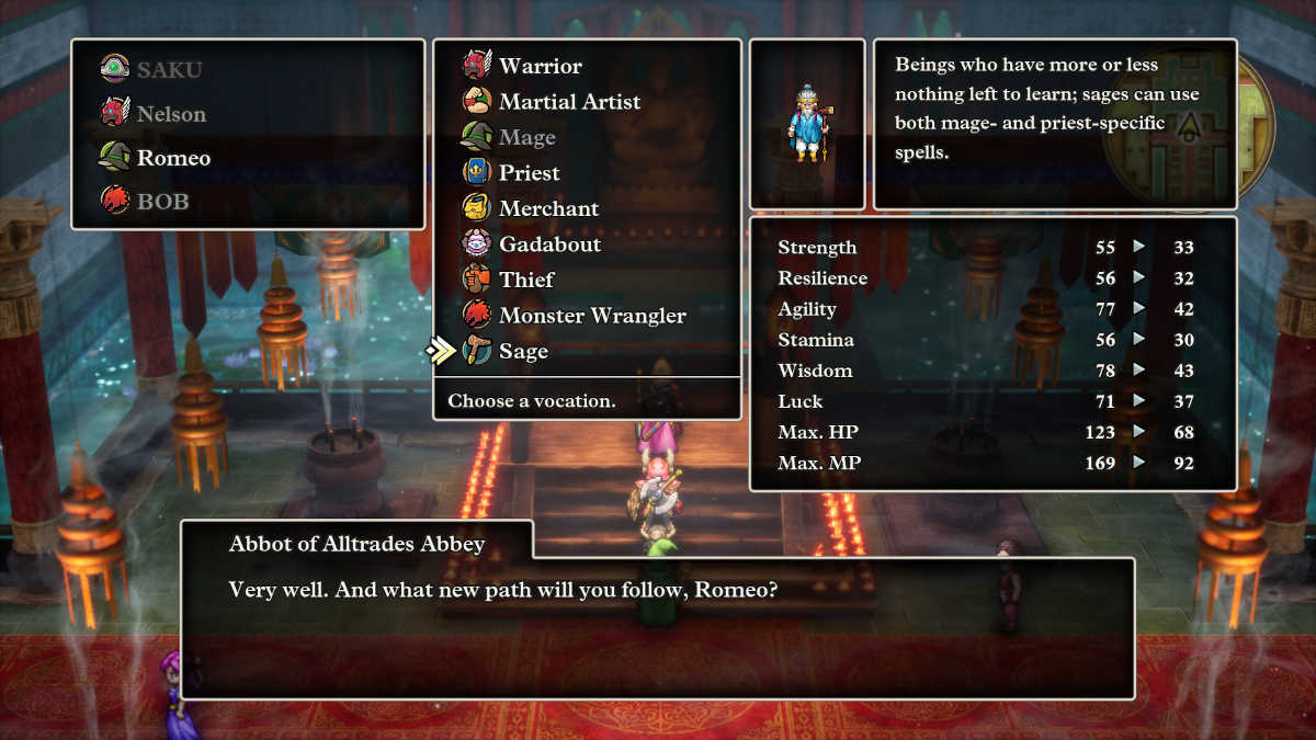 知恵の巻物の言葉を手に入れたので、Alltrades Abbeyに向かい、アボットに話しかけて、意図した賢者の職業を変えることができます。重要なアイテムのストレージに知恵の巻物の言葉があるため、職業の可能性のリストにセージのオプションが追加されます。しておくべきことは確認するだけで、あなたはあなたのパーティーに賢者を持っています。