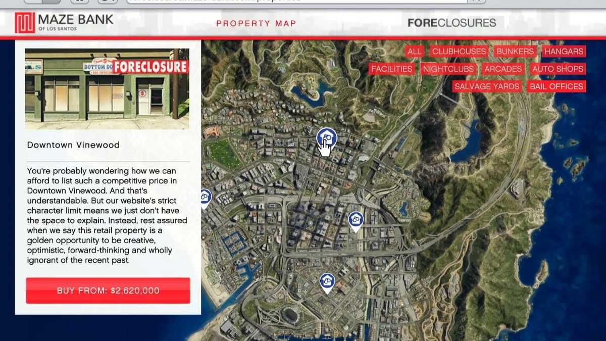 あなたがビネウッドのダウンタウン中にオフィスを持つ上品な男なら、あなたのステータスに合う保釈事務所があります。 Vinewoodのダウンタウンの保釈事務所はGTA 262百万ドルから始まり、最も高価なオプションとなり、GTA $ 4.86百万ドルが完全にアップグレードされました。