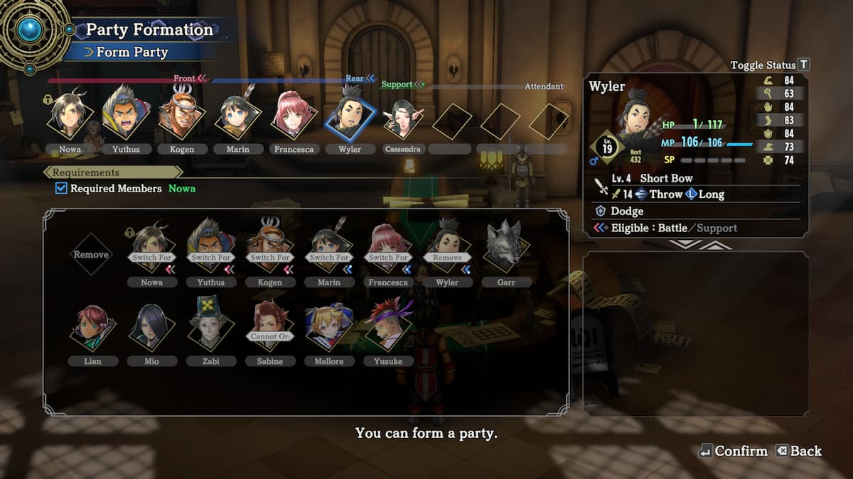 それらの場所でYMIRを見つけたら、彼に話すことで、「パーティーを形成する」オプションを選択することができます。ここでは、あなたのパーティーに配置するすべての利用可能なヒーローのリストと、すでにパーティーに参加しているヒーローを見ることができます。 Nowaのように、特定のキャラクターは、削除できない必要なキャラクターになります。他のすべての人を、前、後部、サポートポジションに配置することができます。