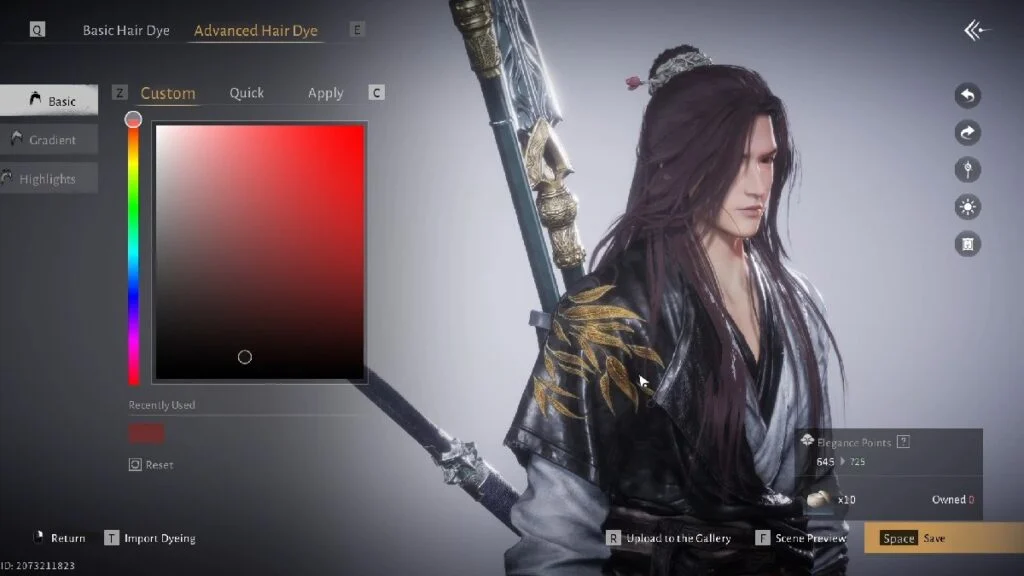 Where Winds Meet のすべてのヘアスタイルが染められるわけではありません。でヘアスタイルを探してください小さな虹のブラシのアイコン、色の変更をサポートするスタイルを示します。