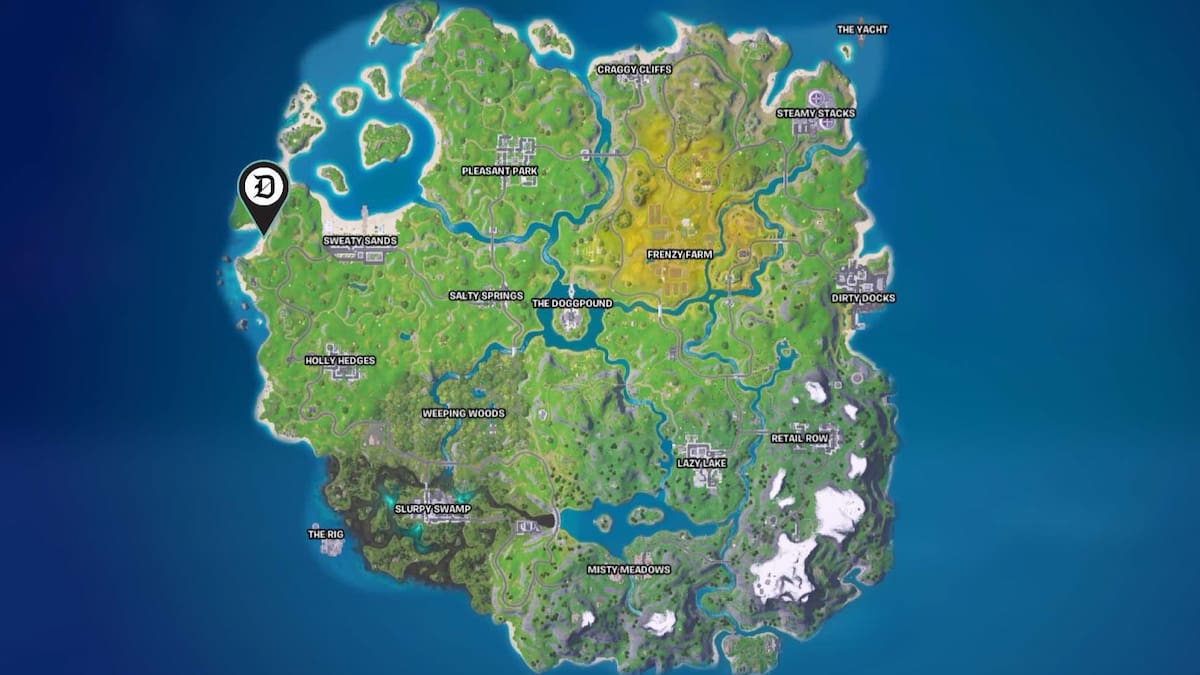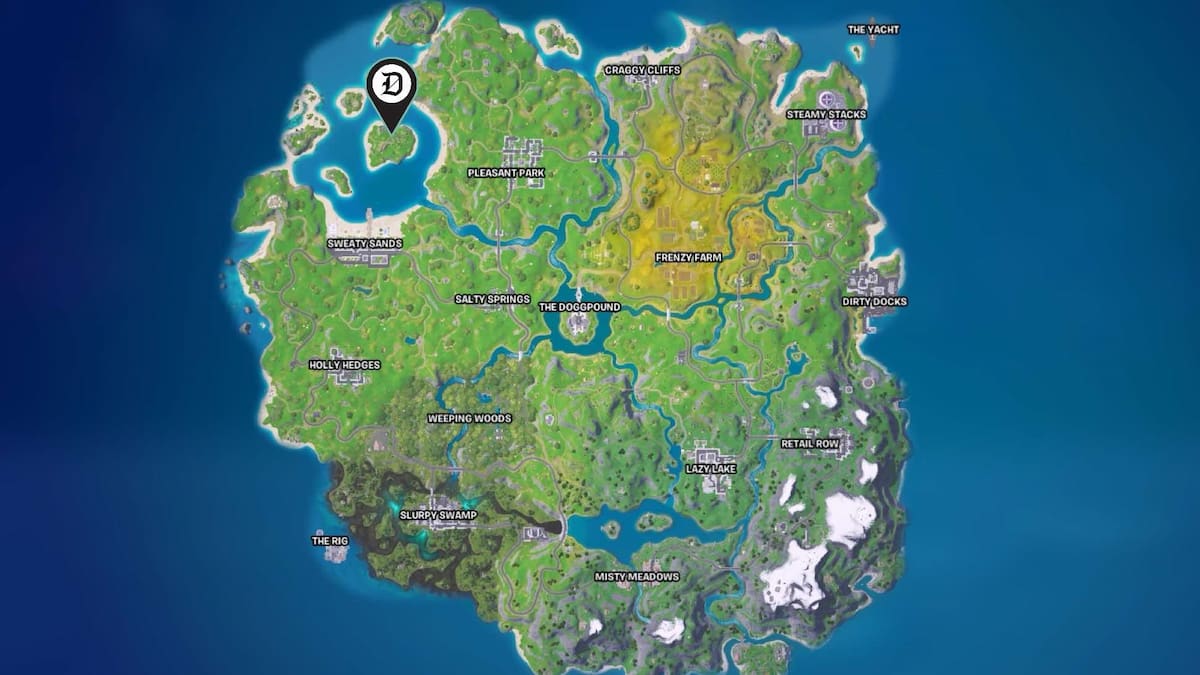 このランドマークは、汗まみれの砂のすぐ北とプレザントパークの西にあります。それはほとんど空の島で、飛行機のcrash落事故が数個あります。通常、この島には大勢の戦利品はありませんが、他のプレイヤーがここにあなたと一緒に着陸しない限り、このタスクを完了するのに十分なはずです。