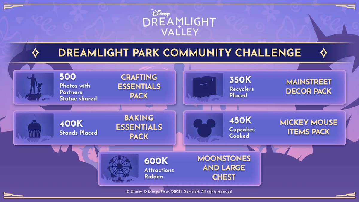 ゲーム内のクエストとタスクに加えて、過去のディズニーパークスイベントと同じように、対応するコミュニティの目標もあります。この目標では、すべてのプレーヤーが協力して特定のアイテムを配置し、コミュニティ全体の報酬を受け取るために完全なタスクを担当する必要があります。これが完了するタスクです: