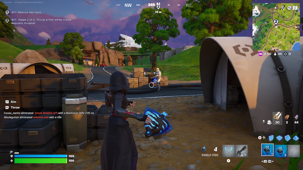 次の段階では、捕まえたばかりの魚を連れて共和国の前post基地に投げ込む必要があります。最寄りの前post基地は、マスクされた牧草地、シーポートシティ、レインボーフィールド周辺の道端にあります。魚を投げるには、装備し、左のトリガー/目的ボタンを押し続けます。右のトリガー/ファイアボタンを使用して投げます。
