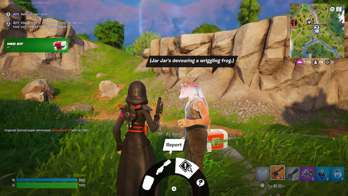 Fortnite第6章、シーズン3のJar Jarのストーリークエストは、完了したステージごとに30,000 XPに加えて、4、7、および10のストーリークエストごとにさらに40,000 XPを提供します。キックジャージャーストーリークエストは、残忍なボックスカーとフォクシーフードゲートの間の川の家で彼を訪問します。ジャージャーは、600ゴールドのチャグジュグ、200ゴールドのCA-87ジャワスコターブラスターも提供しています。