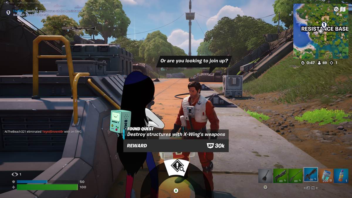 このストーリークエストは、抵抗基地で始まります。ここでは、近くでさまようポーダメロンと話す必要があります。飛行のレッスンの申し出を受け入れ、近くのX-wingの中に入り、飛び回り、車両の武器で25の構造を破壊します。