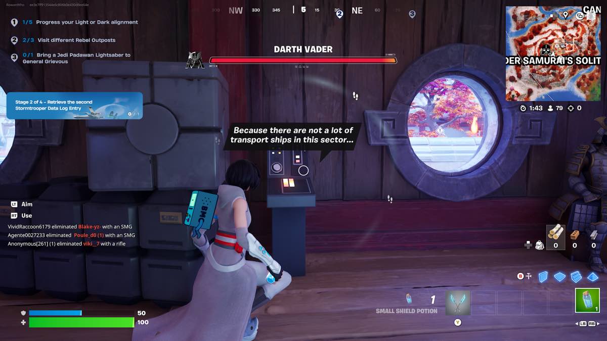 ボーナスクエストとして、Vader Samuraiにアクセスして、StormTrooperのデータログエントリを収集できます。これらはすべて、ベイダーサムライの孤独の周りに散らばっています。ボーナスクエストを完了するには、4人と対話する必要があります。