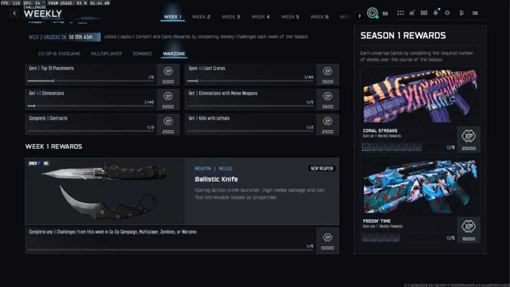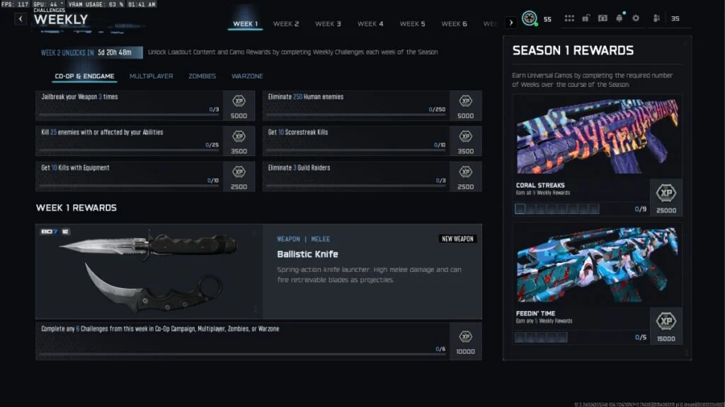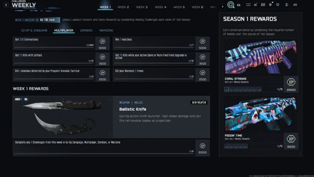 第 1 週では、これらのカテゴリから 6 つのチャレンジを完了して、回収可能な刃を発射して高いダメージを与えるスプリングアクションの近接武器であるバリスティック ナイフのロックを解除することが求められます。各チャレンジでは XP を獲得し、タスクあたり合計 2,500 ~ 5,000 の範囲で、シーズン 1 のアニメーション迷彩の完成に貢献します。