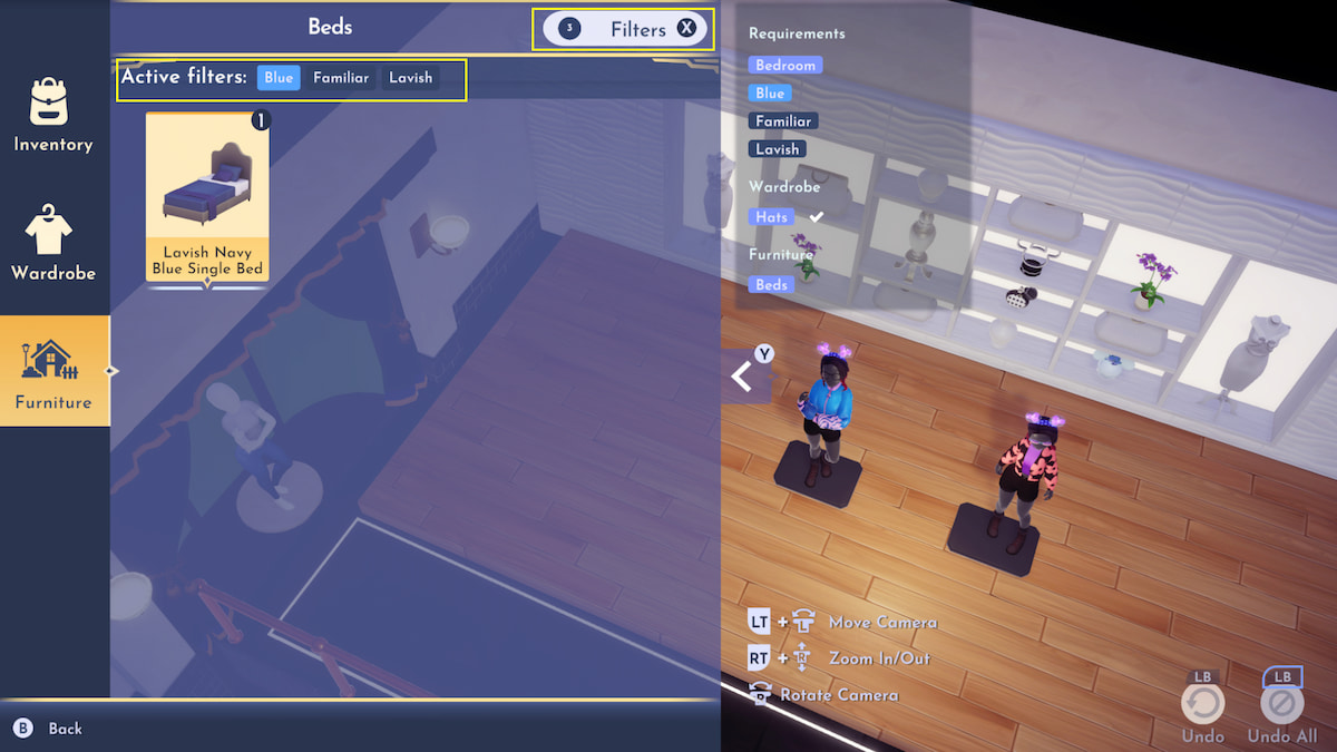 まず、家具メニューを開き、フィルターを使用して、チャレンジ要件に一致するすべてのタグを選択します。これにより、持っているアイテムが絞り込まれ、最初の試みで正しく入手できます。