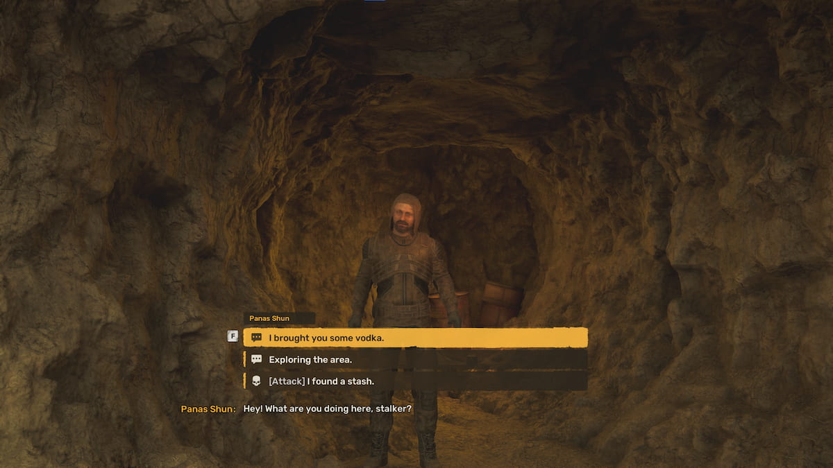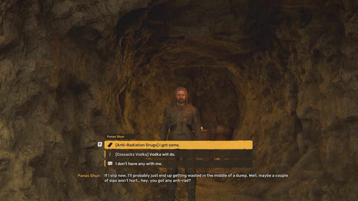 北西部の最終的なキャッシュに到達すると、パナスは洞窟にいます。そして、なぜ彼の隠し場所でウォッカを降ろしているのかについて彼と話すことができます。あなたはそれを選ぶことができます彼の友達が彼の世話をしたいので、あなたがそれをしていることを説明するか、あなたは彼を攻撃することを選ぶことができますあなたが彼の隠し場所にギアを望むなら。あなたが彼を攻撃しないなら、あなたが状況を説明するとき、彼はあなたに感謝します。しかし、彼は辞めたいので、ウォッカではなく反ラッド薬を求めます。あなたが彼に反rad薬を与えた後、彼はあなたに感謝し、あなたのトラブルのために1,300のクーポンを与えて、バドモを完成させます!クエスト。
