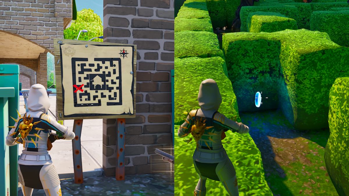 小売列を訪れると、小さなレンガの壁に囲まれた北東の角に巨大なパワーパイロンが見えます。ここには、次の秘密の場所を描いた最終的なトレジャーマップがあります。今回、マップは迷路内の特定のポイントを示しています。 Fortnite OGシーズン3マップで私たちが知っている唯一の迷路は、嘆きの森の中にあります。そこに向かうと、迷路の南東部に浮かぶ青いフープがあります。 10,000 XPを請求するためにそれをつかみます。