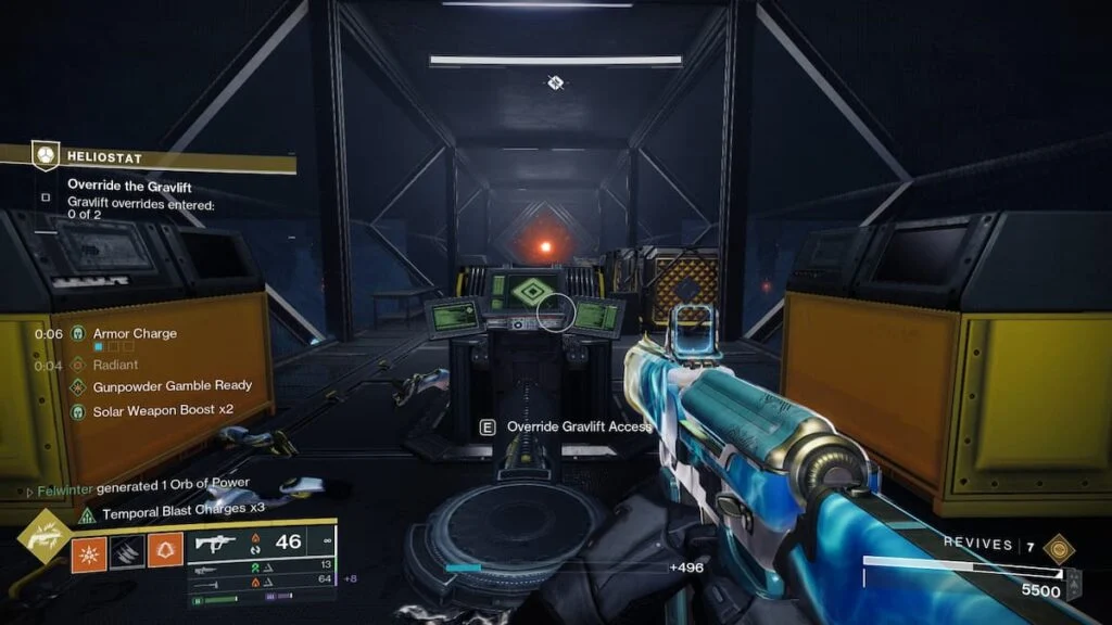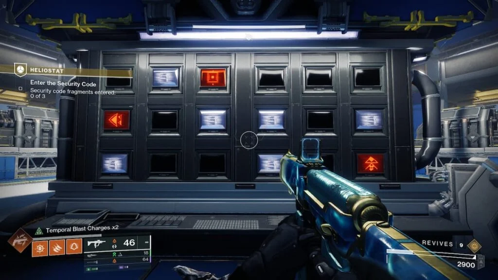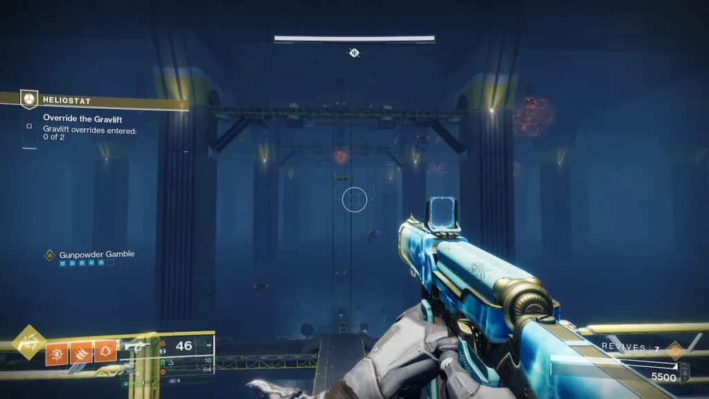 次の部屋でも同じことをする必要がありますが、遭遇を進めるためにノードを撃つことも必要です。これらのノードは、Spire of the Watcher ダンジョンと同じように、青く輝くダイヤモンドのように見えます。ノードを撃ち、バリアを取り除き、部屋の中央にあるハッチが開くまで洗い流しを繰り返します。