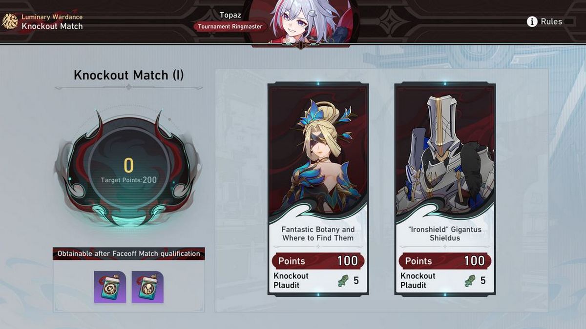 Topaz、BoothillなどのゲームのキャラクターであるRingmasterに挑戦したいたびに、最終的にYanqingまで、2人のマイナーな対戦相手と最初にノックアウトマッチに参加する必要があります。